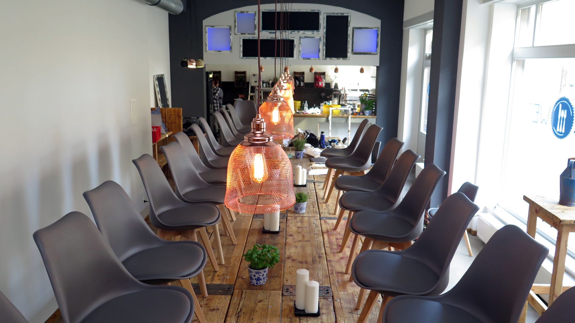 „Wir haben ganz viel selbst gemacht“, berichtet René Neyka und Dan ergänzt lachend: „Für das Tischlerhandwerk sind wir aber viel zu langsam.“ Heute haben sie alle Tische in die Mitte gestellt, weil es morgen eine Party geben soll. Für den normalen Mittagsbetrieb sollen die Tische allerdings einzeln stehen. Schade eigentlich. Denn hier könnten auch die Ritter der Tafelrunde futtern.