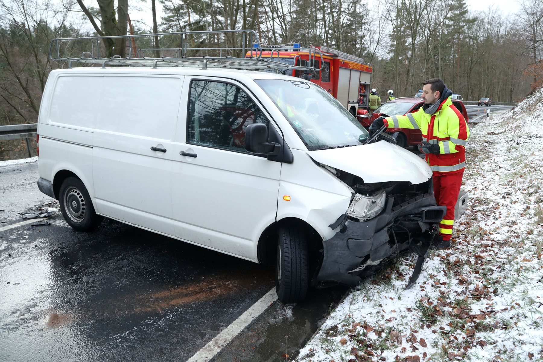 Der Unfall ereignete sich gegen 13.30 Uhr, am 14. Januar. Der Fahrer eines VW-Transporters war in Richtung Dresden unterwegs. Kurz vor der Heidemühle verlor er in einer Rechtskurve die Kontrolle über seinen Wagen und schleuderte gegen einen entgegenkommenden VW Touran. Die Straße war aufgrund von Schneefall ziemlich glatt.