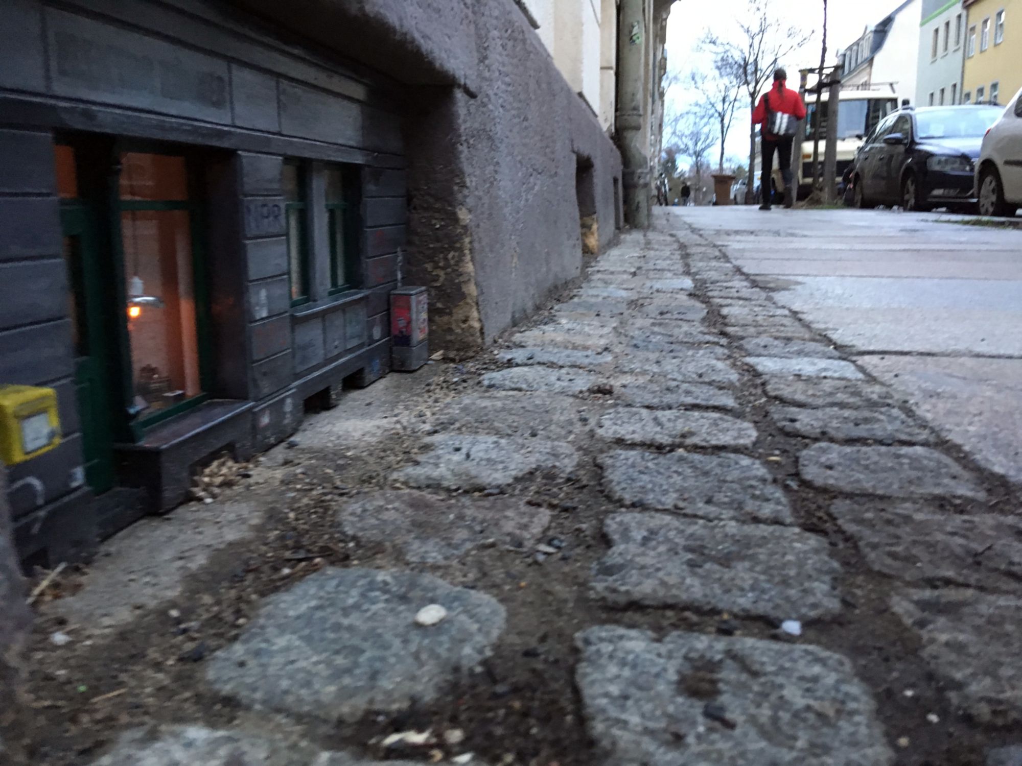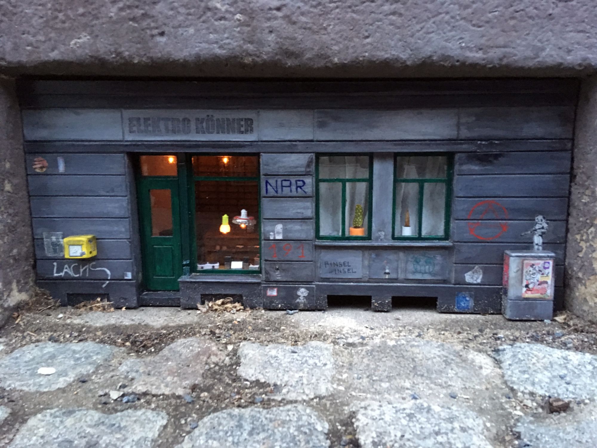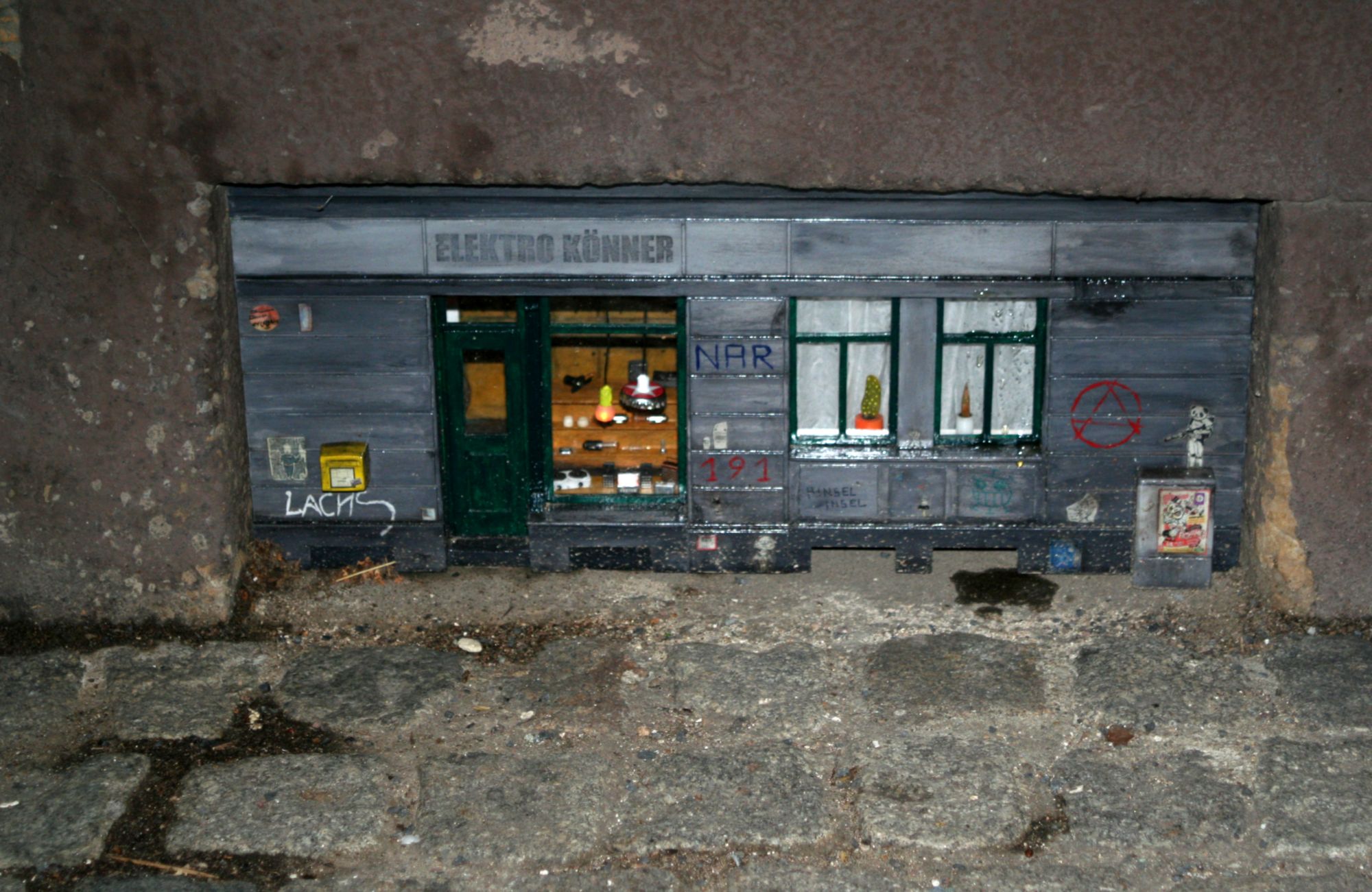 Miniaturkünstler haben auf der Sebnitzer Straße ein Kellerfenster gestaltet. So gibt es nun ein neues Ladengeschäft von „Elektro Könner“, einen neuen Briefkasten, einen riesigen Kaktus und wunderbare Anspielungen auf typische Neustadt-Graffiti.