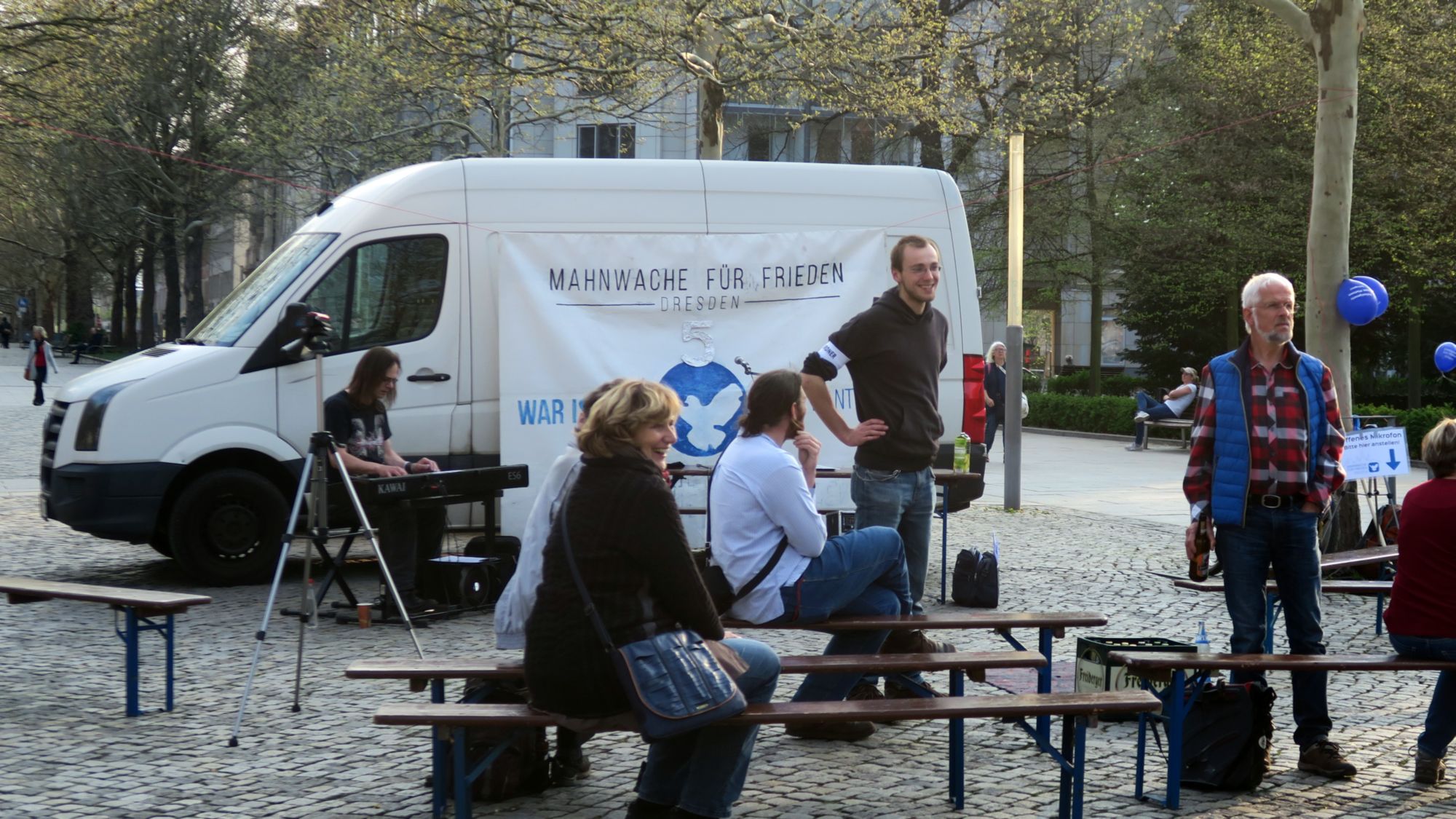 Die Demonstration startete mit leichter Verspätung um 18.30 Uhr am Jorge-Gomondai-Platz, die eigentlich dort seit fünf Jahren immer montags demonstrierenden Teilnehmer*innen der Mahnwache für Frieden Dresden machten extra eine kleine Pause.