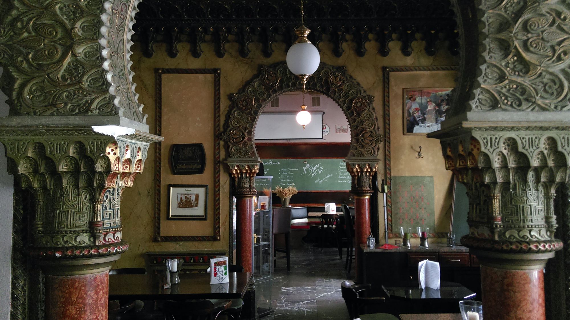Das Besondere an den Räumen, sie sind im maurischen Stil ausgebaut. Die Innenraumgestaltung steht genauso unter Denkmalschutz, wie das ganze Haus.