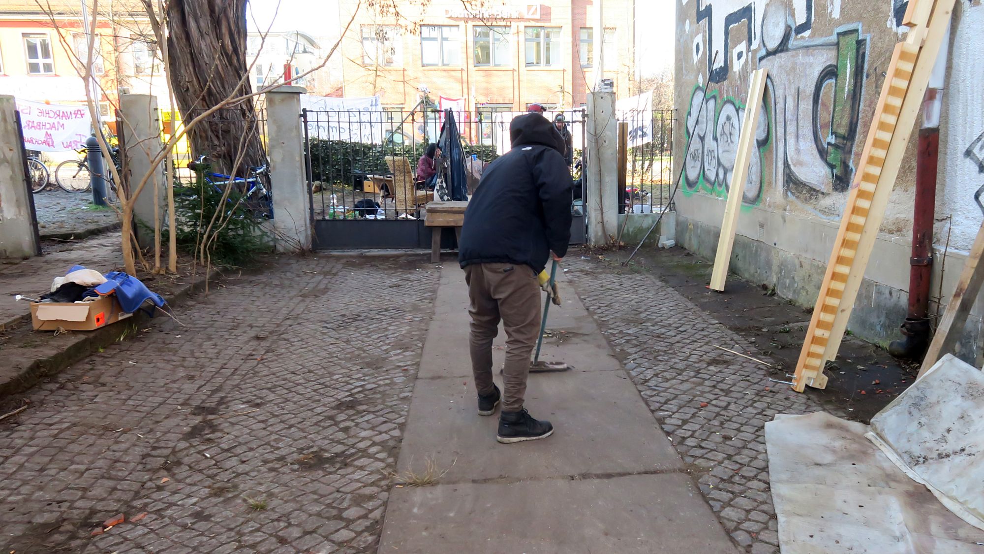 Hinter den Häusern habe man Unkraut entfernt und auch schon einige Räume aufgeräumt. Einige Öfen wurden in Betrieb genommen, so dass es in den Häusern nicht mehr ganz so kalt ist. Insgesamt ist die Gruppe eher überrascht, dass sie so lange vor Ort bleiben konnten. Lann Schmidt freut sich über die umfangreiche Unterstützung: „Uns wurde Essen gebracht, Getränke, die Bands spielen umsonst, am Abend gab es kleine Spenden“.