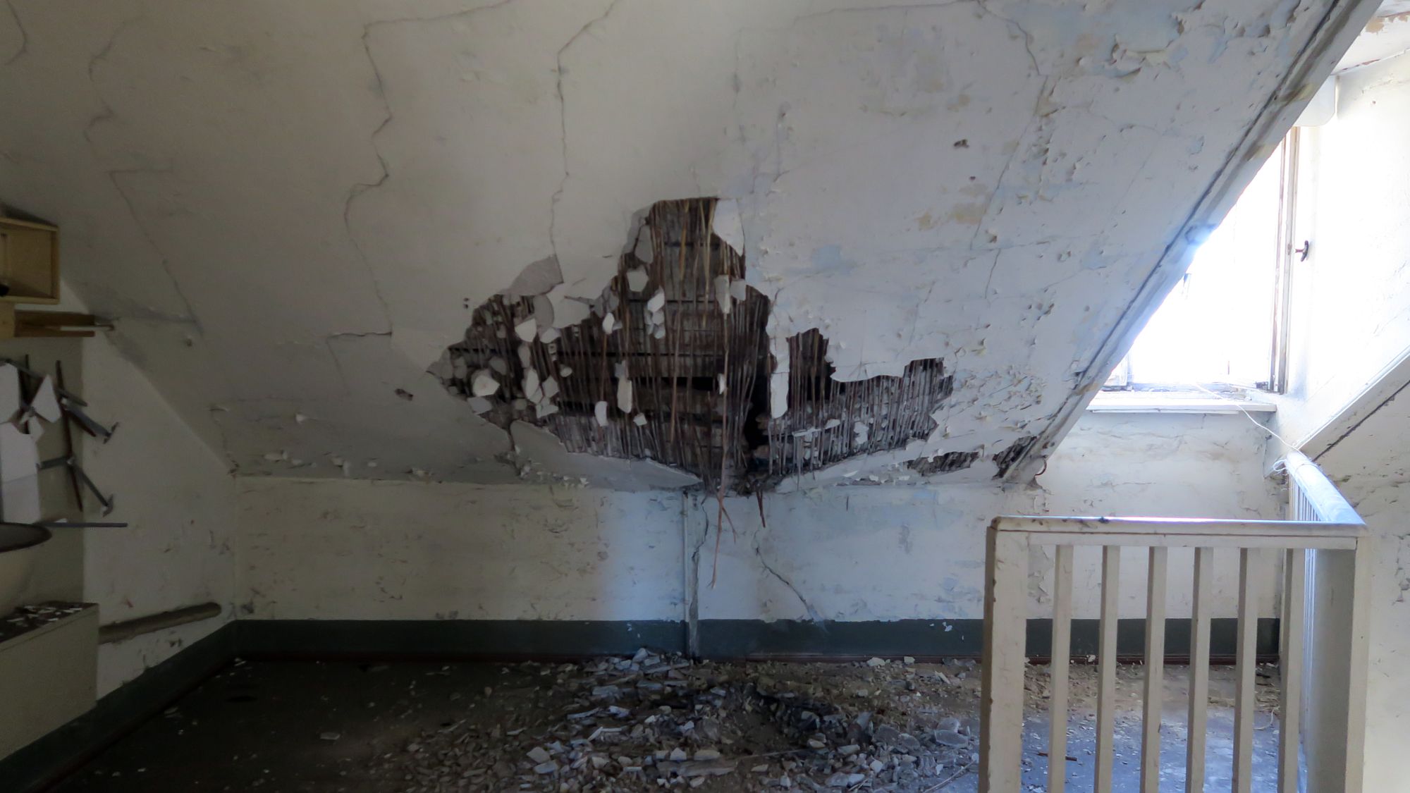 In eines der Gebäude kann man durch die Hintertür hineingehen. Der Zustand der einst wohl ziemlich schmucken Villa ist erbärmlich. Der jahrelange Leerstand hat Spuren hinterlassen. Das Dach ist an einer Stelle ziemlich durchgedrückt, dennoch von einsturzgefährdet wollen die Besetzer*innen nicht sprechen.