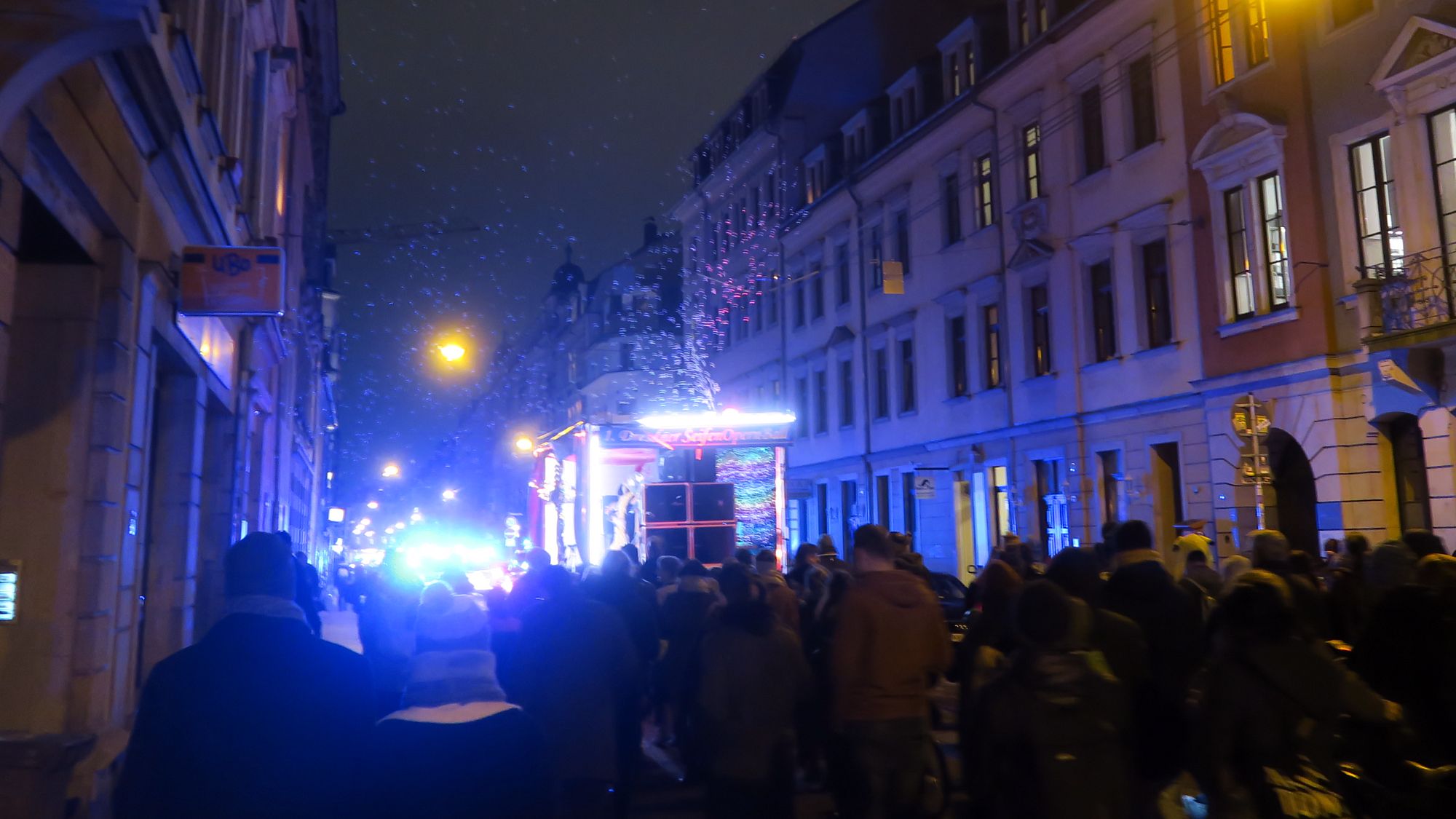 Kurz nach 18 Uhr startete der Umzug, begleitet von etlichen Kindern und ganz vielen Seifenblasen. Über die Görlitzer und Rothenburger ging es zum Albertplatz, dann über die Carolabrücke zum Schlossplatz. Dort spielte dann noch die Banda Kommunale auf.