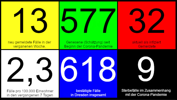 Die Ministerpräsidenten der Länder haben sich mit der Bundesregierung verständigt, dass Lockerungen regional wieder zurück genommen werden, wenn in einem Landkreis bzw. einer kreisfreien Stadt in einer Woche mehr als 50 Neuinfektionen pro 100.000 Einwohner getestet werden. Dieser Wert wurde in Dresden nie erreicht, er liegt seit Anfang Mai kontinuierlich unter 5, am heutigen Sonntag betrug dieser Wert 2,3.
