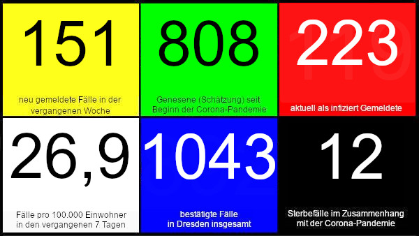 Seit Freitag, dem 9. Oktober zeigt die Ampel auf Gelb. Am Sonntag betrug der Wert 26,9. Das ist der höchste Wert seit Einführung der Corona-Ampel in Dresden. Am Freitag, dem 9. Oktober waren 50 Personen mit COVID-19-Infektion gemeldet, so viele, wie noch nie zuvor.