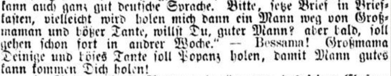 „Lieber Mann, habe gehört von dem Blatte Deinem, dass bekommen man kann Ehegatten. Nun haben will ich einen solchen. Ich weit her aus Ungarn mit Großmaman und Tante kommen bin, habe nicht gut. Großmama und Tante böse, böse, behandeln mich schlecht, soll gehen wieder nach Ungarn mit, ich aber will bleiben in schönen Dresden, kann mich nicht halten ein Mann hier? Geld habe viel ich bekommen von meiner Maman, wie sie gestorben, bin jung, hübsch, werde werden bald 20 Jahr, kann auch ganz gut deutsche Sprache. Bitte, setze Brief in Briefkasten, vielleicht wird holen mich dann ein Mann weg von Großmaman und böser Tante, willst Du, guter Mann? Aber bald, soll gehen schon fort in andere Woche.“ 4