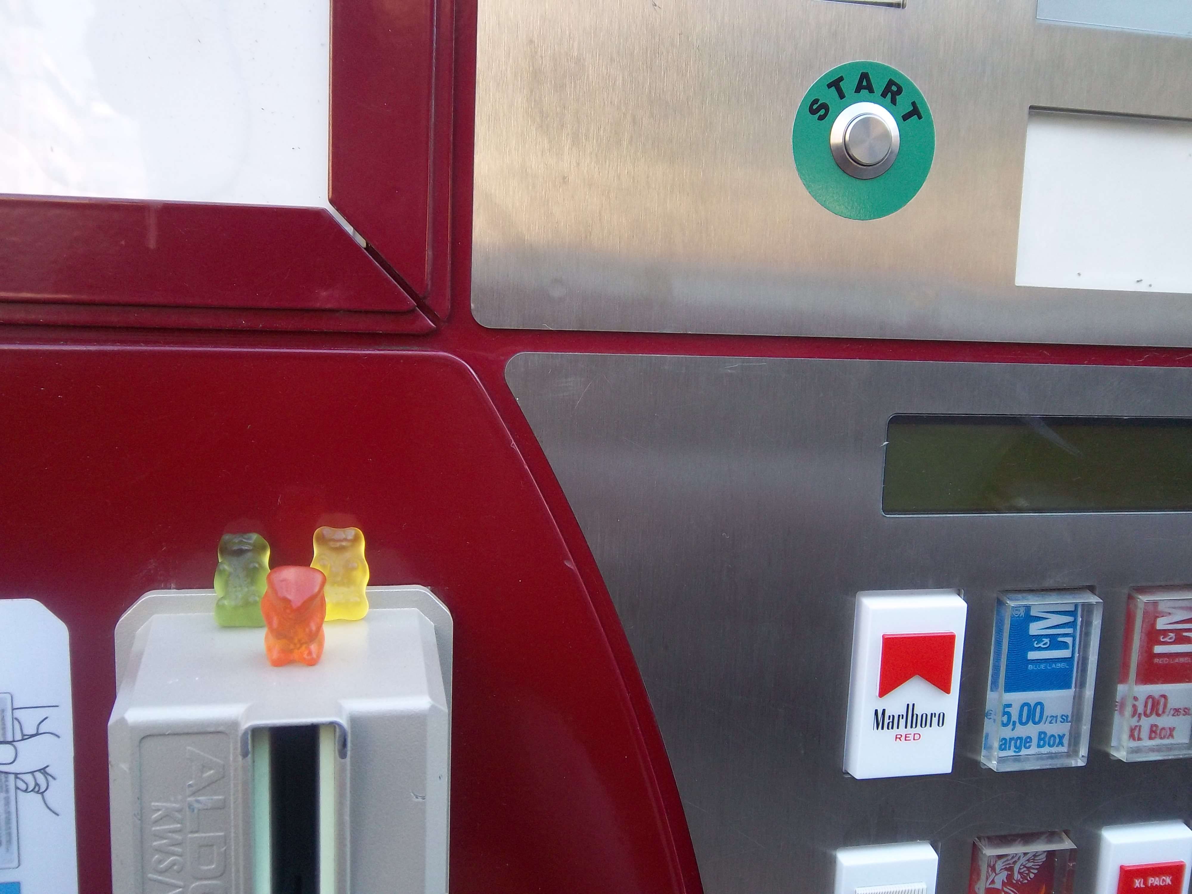 Diese ampelfarbene Bärchenarmee überwacht den Zigarettenautomaten am Martin-Luther-Platz. Gestern waren es noch fünf …