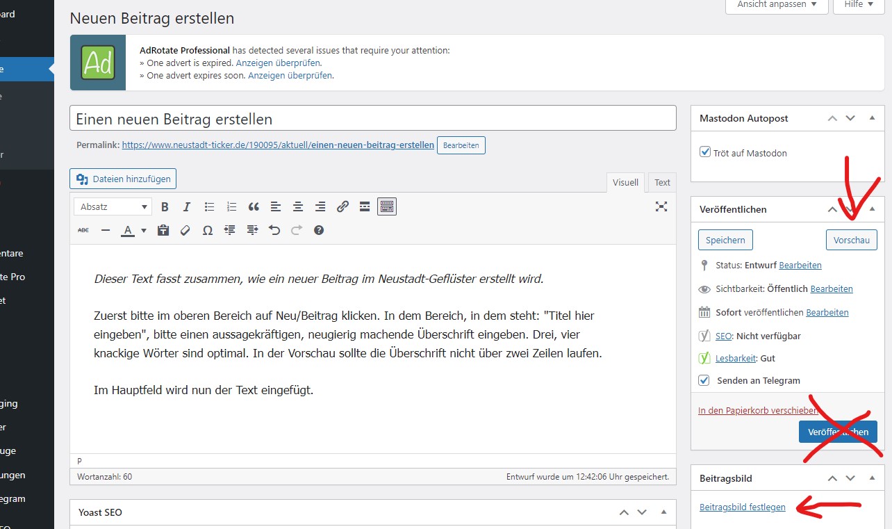 Mit „Speichern“ bitte den Artikel speichern. Nicht auf „Veröffentlichen“ klicken. Mit „Vorschau“ könnt ihr euch anzeigen lassen, wie der fertige Artikel aussehen wird. Nach dem Speichern auf (alle Beiträge) links in der Spalte klicken. Damit ist man als Bearbeiter raus aus dem Artikel und der Korrektor kann übernehmenn.