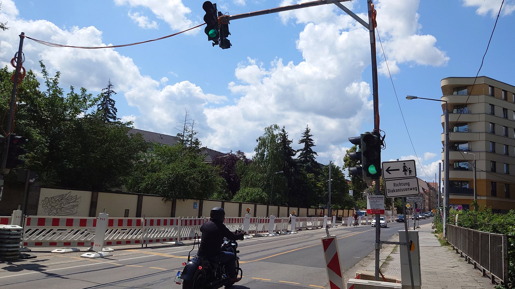 Pünktlich zum Ferienbeginn geht es also in Richtung Weißer Hirsch an der Kreuzung Bautzner/Lesingstraße am Pferdekopfbrunnen halbrechts weg. Die Kreuzung hat eine provisorische Ampel erhalten. Um den Verkehrsfluss zu gewährleisten, ist die Lessingstraße von der Elbe aus dann nicht mehr durchführend. Die Holzhofgasse wird zur Einbahnstraße. Dort darf dann wieder einseitig geparkt werden.