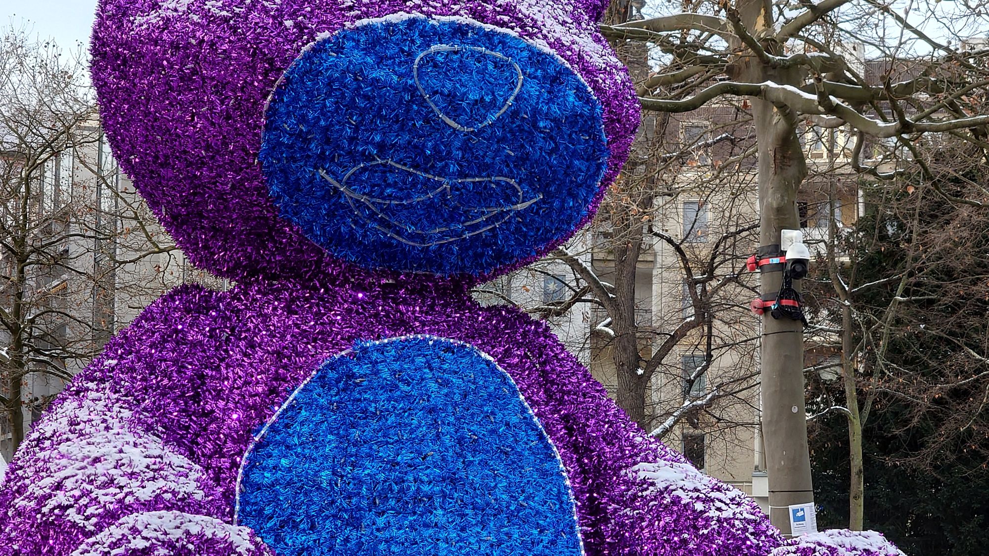 Er ist eines der Wahrzeichen des Augustusmarktes: der lila Teddy. Besonders bei Kids, aber auch als Fotomotiv sehr beliebt. Am Sonnabend haben gegen 22.45 Uhr bislang Unbekannte so stark an ihm gezerrt, dass er fast von seinem Podest gestürzt ist.