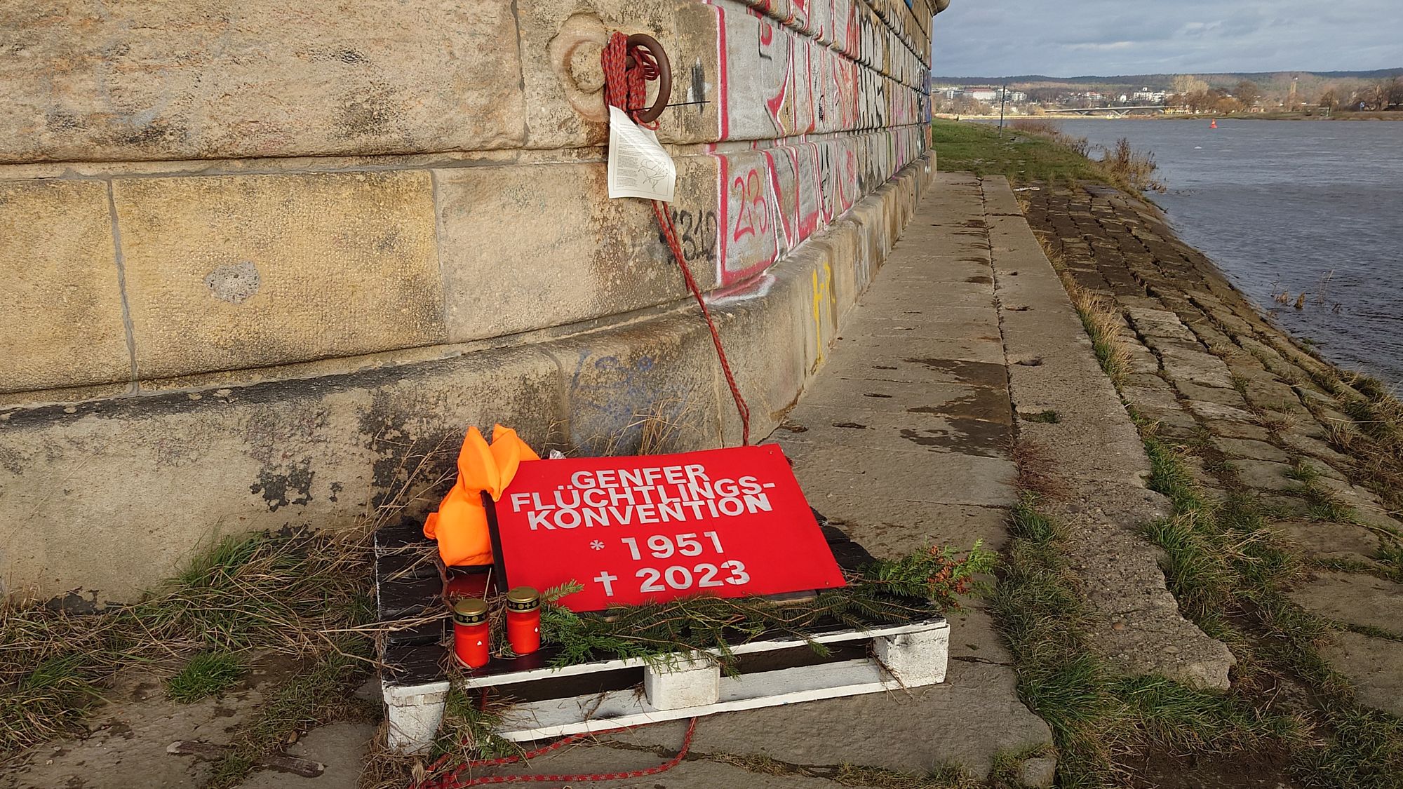 Mit einer Kunstinstallation am Elbufer wollen bislang Unbekannte auf die tragische Situation entlang der Flüchtlingsrouten aufmerksam machen. Ein symbolisches Floß ist an einem alten Ringstein mit einem Rettungsseil festgemacht. Zwei Grabkerzen, Grabgestecke und eine Rettungsweste weisen auf die vielen tausend Toten hin, die auf dem Weg nach Europa gestorben sind.