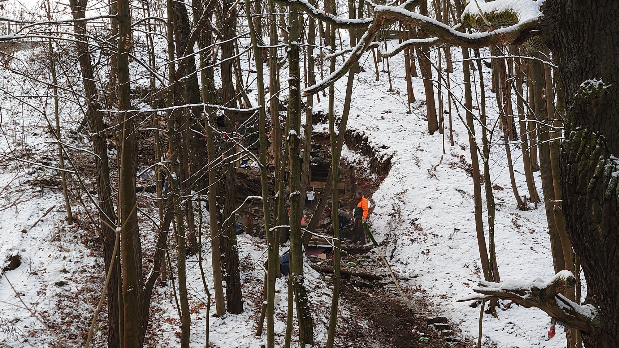 Seit den Morgenstunden sind Mitarbeitende des Sachsenforst und des Ordnungsamtes damit beschäftigt, die Hütte am Hang zur Stauffenbergallee zu räumen. Ein Mann hatte die Hütte seit etwas mehr als vier Jahren angelegt. Anfangs hatte er nur Äste und Zweige zusammengetragen. Im Laufe der Jahre hatte er unter der Hütte in den Hang hineingegraben und auch einen Vorplatz angelegt.