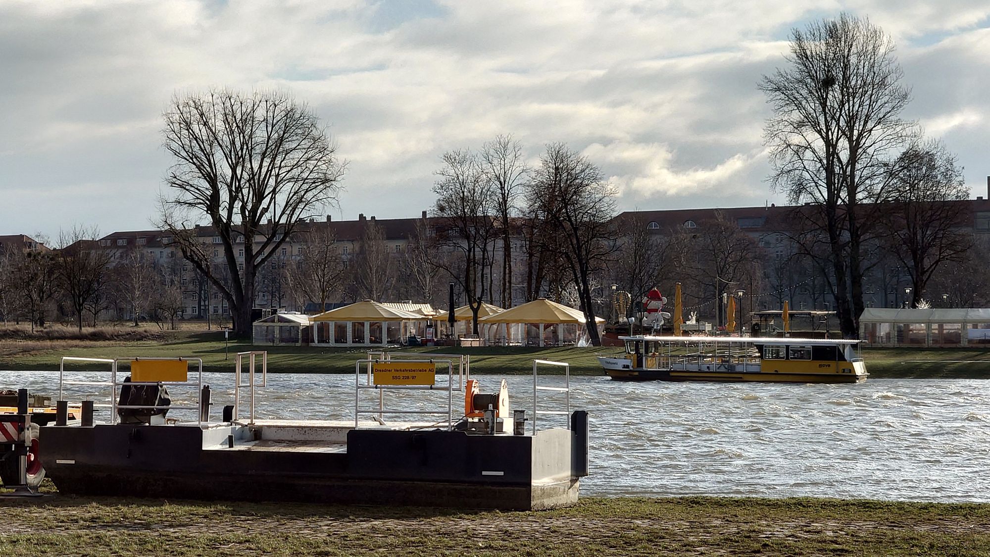 Wegen des Hochwassers über die Feiertage und am Jahresanfang mussten die DVB-Fähren zeitweise ihren Betrieb einstellen. Zwar können an allen Fährstellen die Anleger passend zum Wasserstand in ihrer Lage am Fluss verändert werden, aber bei sehr hohen oder auch ganz niedrigen Pegelständen endet diese Flexibilität. Während die Fährstellen in Laubegast und Kleinzschachwitz bereits am vergangenen Sonnabend und damit vergleichsweise schnell wieder ihren Betrieb aufnehmen konnten, mussten die Verantwortlichen am Anleger Johannstadt – Neustadt am Montag erst eine größere Säuberungsaktion starten, um dort das Treibgut vom letzten Hochwasser zu entfernen. Nachdem der Elektriker am Dienstag früh noch die Stegbeleuchtungen überprüft hat, ist seit 7 Uhr auch die Fährstelle in Johannstadt wieder planmäßig in Betrieb.