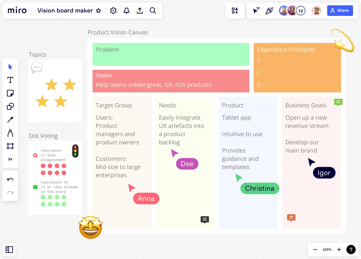Durch die Onlineerstellung des Vision Boards verbessert sich die Produktplanung mithilfe der Visualisierung. Ideen werden einfach skizziert, auch unterstützt ein Vision Board das Brainstorming und die Festlegung konkreter Produktziele. All das findet in einem einzigen Arbeitsbereich statt, der sich zudem teilen lässt. Dies geschieht über Kollaborationsfunktionen. Andere Mitglieder des Teams können in Echtzeit, aber auch asynchron am Vision Board arbeiten. Die Beteiligten lassen sich in Kommentaren markieren. Es ist hilfreiches Feedback möglich, auch funktionieren Iterierationen schneller üblich. Schon für das erste Brainstorming sollten Anwender ein Vision Board online erstellen. Es hilft dem Team dann weiter bis zur abschließenden Präsentation. Hierfür wechseln die Anwender vom vorherigen Erstellungs- in den relevanten Präsentationsmodus, damit Stakeholder zustimmen können. Diese Zustimmung ist umso eher wahrscheinlich, je schöner und professioneller das Vision Board die Ideen präsentiert. Bei der Erstellung helfen Tool-Integrationen. Das können bewährte Werkzeuge anderer Softwareanbieter sein, so etwa die Adobe Creative Suite oder Google Drive. Auch auf dem Vision Bord finden sich zahlreiche Bearbeitungswerkzeuge und vorgefertigte Vorlagen.