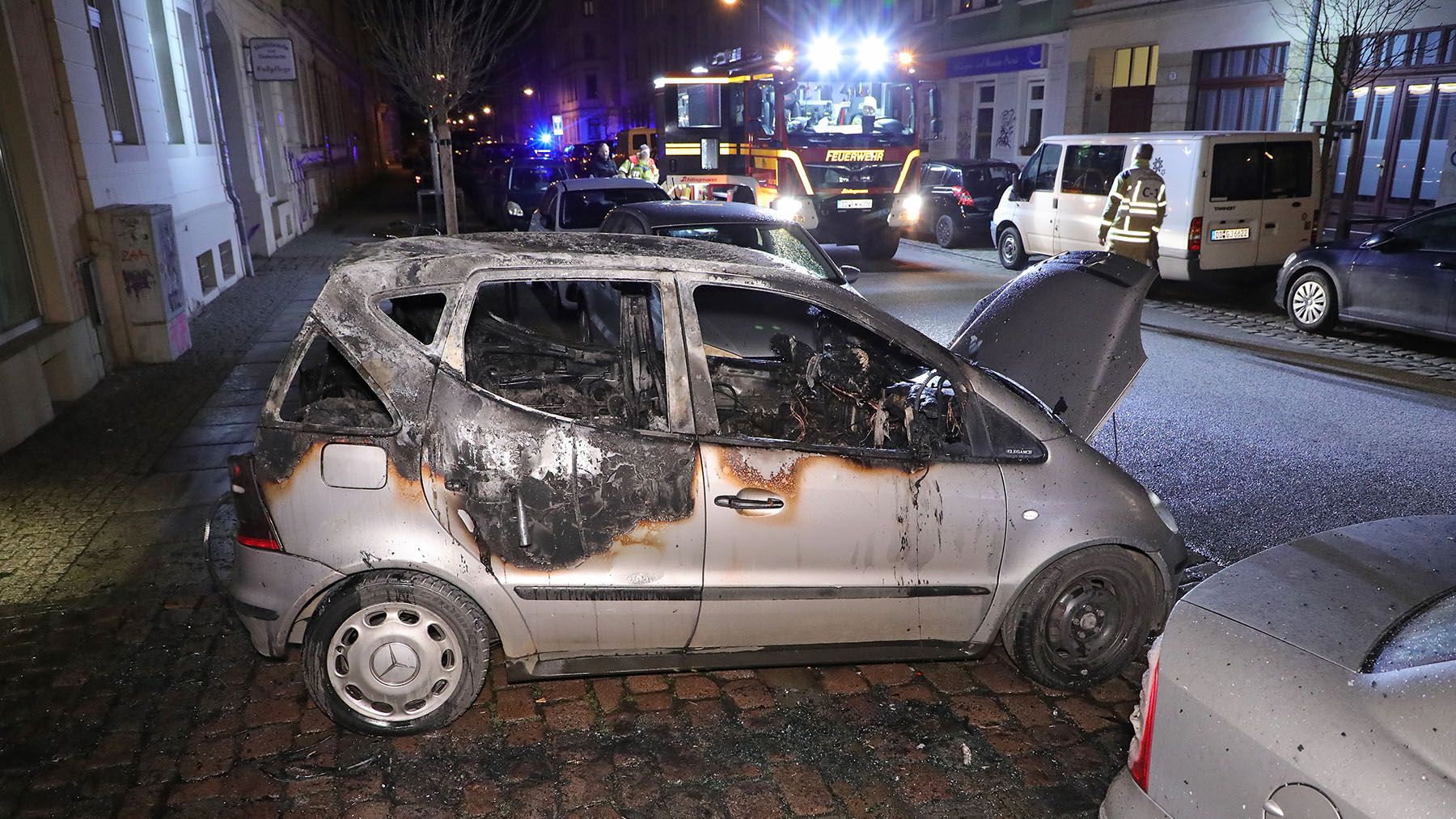 Als die Einsatzkräfte die Einsatzstelle an der Hechtstraße erreichten, stand die etwas ältere Mercedes A-Klasse bereits komplett in Flammen. Durch die große Hitzeentwicklung wurde auch ein unmittelbar daneben geparkter Opel Astra beschädigt.