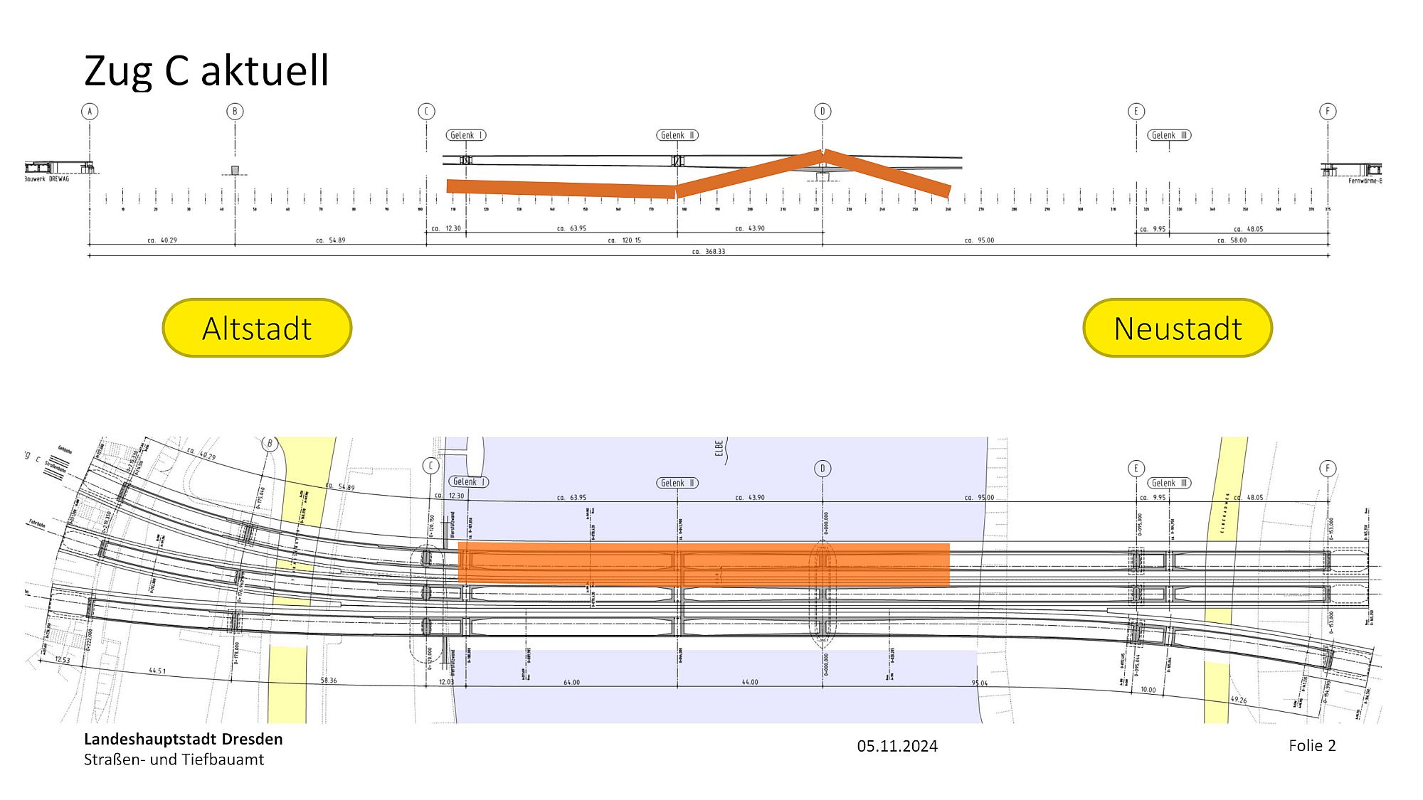 Die beiden schrägen Teile des Zuges C werden anschließend von der Neustädter Seite in Angriff genommen. Auch hier wird eine zusätzliche Baustraße benötigt. Diese Arbeiten können jedoch erst im Januar 2025 beginnen, da SachsenEnergie den Bereich weiterhin für die Verlegung neuer Fernwärmeleitungen nutzt.