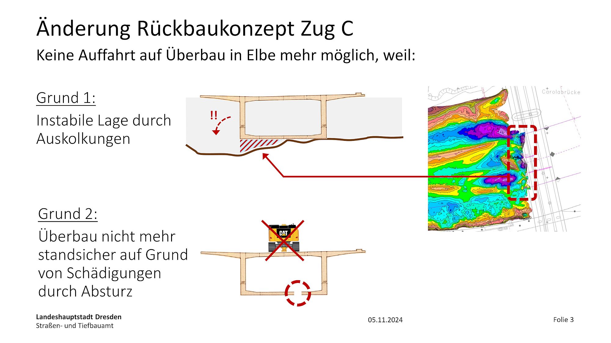 Neue Untersuchungen machen eine Anpassung des Abbruchkonzeptes für die in der Elbe befindlichen Teile des Zuges C der Carolabrücke erforderlich. In Fließrichtung haben sich unter dem Brückenteil in der Elbe Auskolkungen (Auswaschungen) gebildet. Dadurch ist das Brückenteil nicht mehr stabil genug, um befahren zu werden. Zudem wird angenommen, dass es beim Absturz beschädigt wurde und dadurch die ursprünglich geplante Befahrbarkeit verloren hat. Ursprünglich war vorgesehen, dass die Abbruchbagger über das in der Elbe liegende Teil vorrücken und es Stück für Stück abtragen.