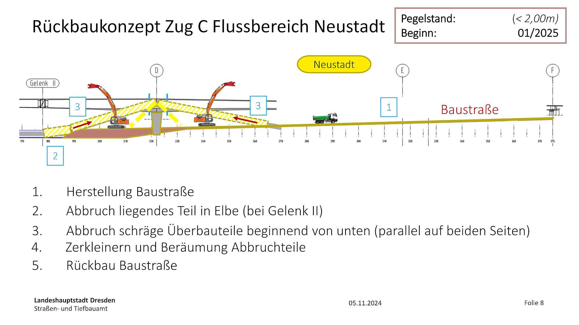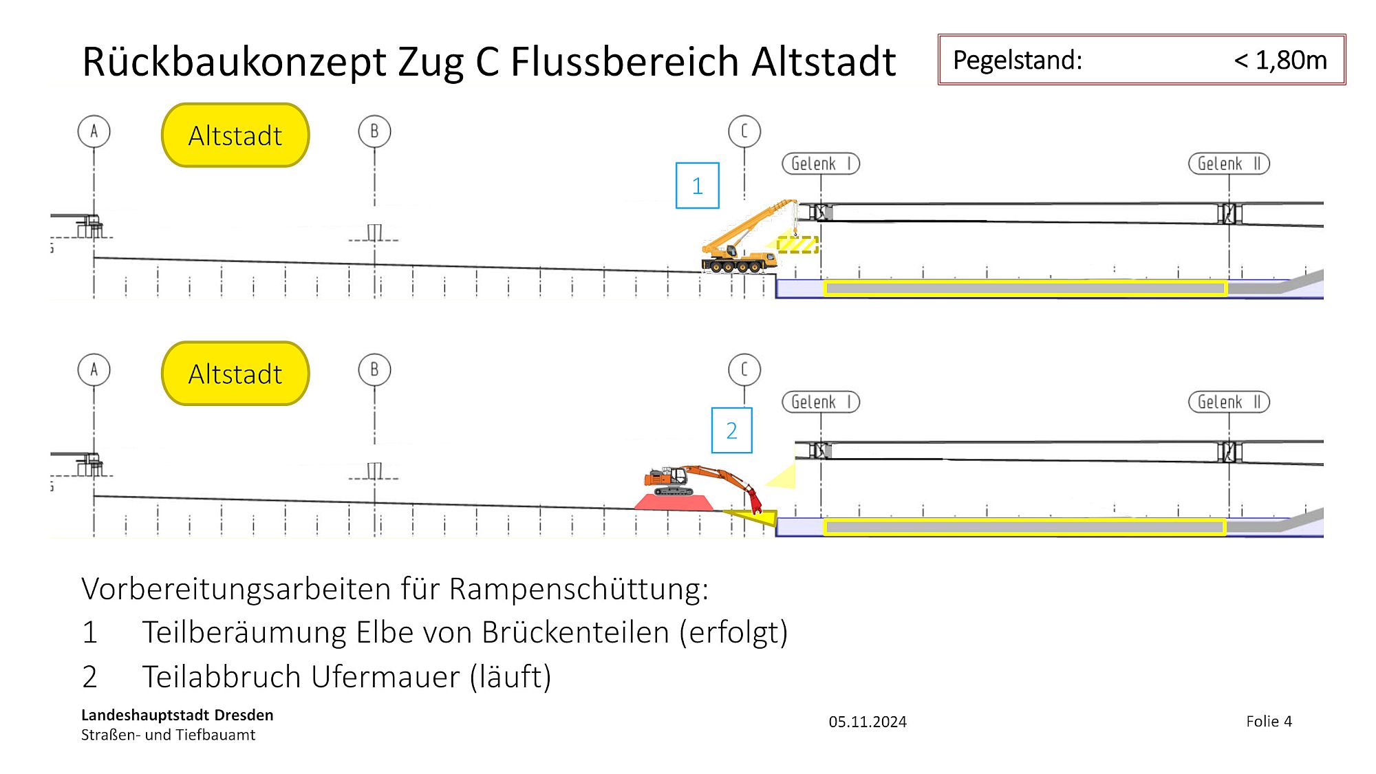 Wie die Stadtverwaltung heute mitteilt, wurde in der vergangenen Woche der Abriss der ersten fünf Meter des in der Elbe liegenden Teils am Altstädter Ufer abgeschlossen. Derzeit erfolgt der Abriss der Ufermauer, um weitere Arbeiten vorzubereiten. Mitte Dezember soll es eine Entscheidung zum weiteren Vorgehen bezüglich der Brückenzüge B und A und dem Schiffsverkehr geben.