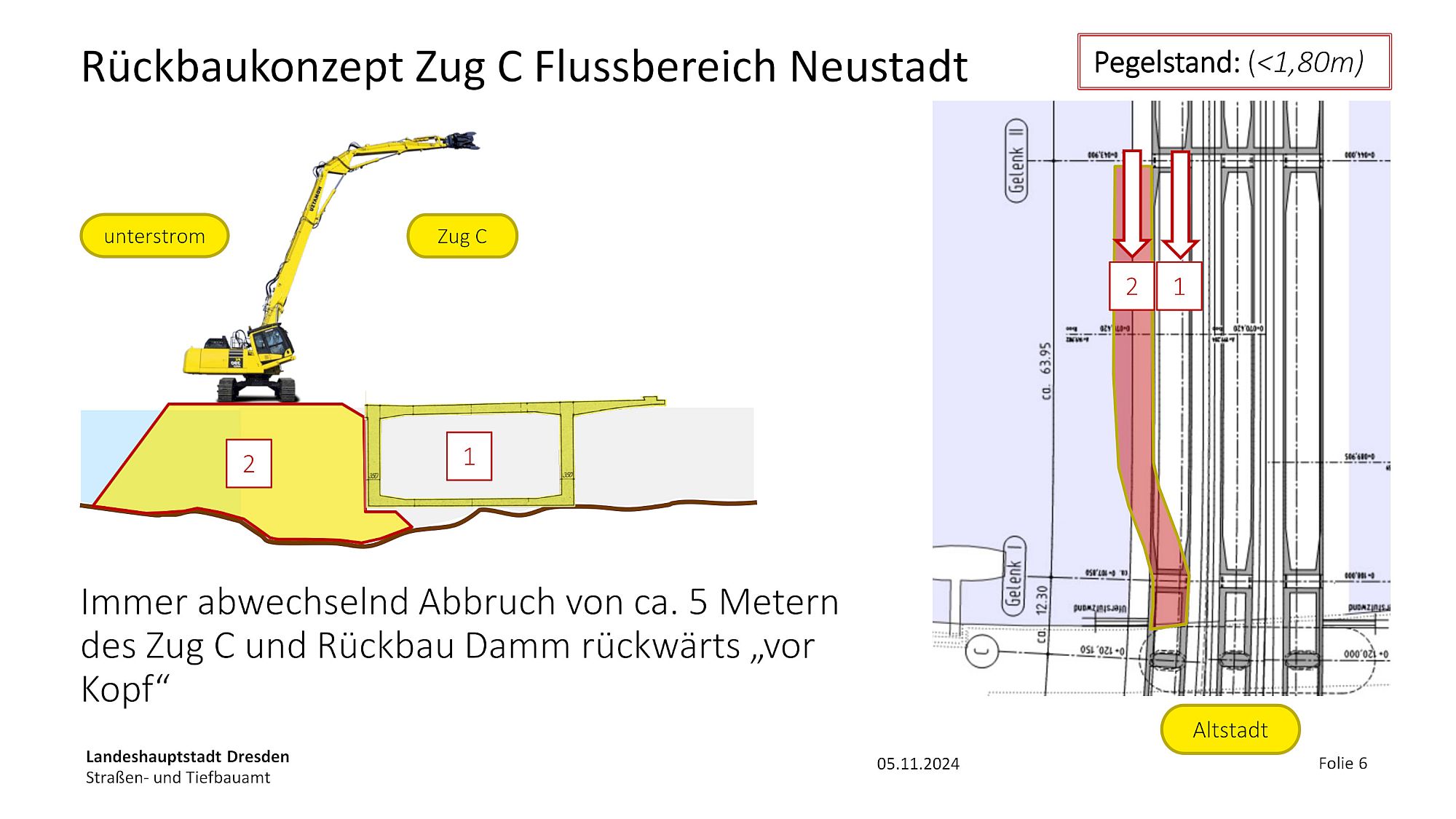 Ein Bagger soll auf der neuen Baustraße zum Einsatz kommen. Dazu wird zuerst ein Abschnitt des Kragarmes1 der Brücke von drei bis vier Metern Länge abgebrochen. Danach kann in diesem Bereich der Damm weiter aufgeschüttet werden. Dieser Prozess wird abschnittsweise und abwechselnd durchgeführt. Sobald der Damm fertig ist, erfolgt der Abriss des Zuges C rückwärts „vor Kopf“, also von der Neustädter zur Altstädter Seite. Dabei werden abwechselnd jeweils etwa fünf Meter des Zuges C abgebrochen und der Damm zurückgebaut.