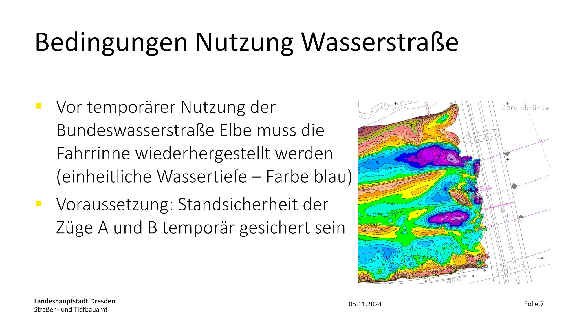 Bevor die Bundeswasserstraße Elbe zumindest temporär wieder befahrbar wird, muss die Fahrrinne mit einer einheitlichen Wassertiefe wiederhergestellt werden. Durch den Brückenzug haben sich Anlandungen gebildet, die als Abflusshindernis wirken. Eine wichtige Voraussetzung für die Durchfahrt von Schiffen unter der Carolabrücke ist die temporäre Standsicherheit der Brückenzüge A und B. Diese wird derzeit von einem unabhängigen Büro geprüft, mit Ergebnissen in der ersten Dezemberhälfte.