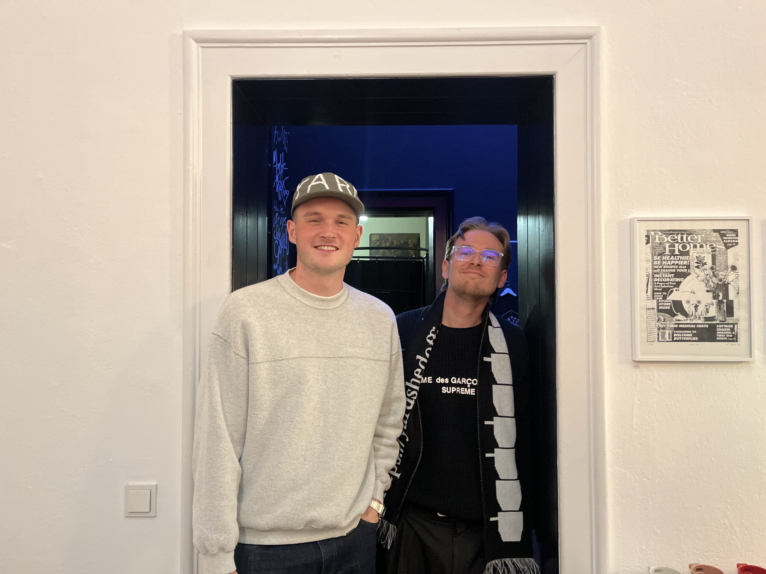 Als ich das Designduo Ole Müller und Kolja Kirsch für einen Moment aus den Gesprächen und Glückwünschen von Freundinnen, Freunden und Familie herauszog, sah man den beiden die erste Nervosität weichen. „Die anfängliche Nervosität ist verflogen und jetzt geht’s uns ganz gut“, sagte Ole, der sich erst einmal einen Platz auf dem Stuhl suchte.