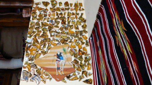 Die Salatbeilage erinnert stark an deutsche Hausmannskost.In der Karte gibt es arabische Speisen mit Schwerpunkt Algerien. Ich ordere einen algerischen Börek. Nach wenigen Minuten stellt mir die Köchin das Gericht auf den Tisch. Dabei handelt es sich um hauchdünne Teigblätter, die ganz eng um eine Hackfleischfüllung gerollt sind, dazu gibt es Salat und Gurke und Tomate. Auf den ersten Blick wirken die Börek-Stangen wie zu groß und zu gelb gewordene Zigarren. Ich lange zu. Wüstenmotive wohin man schaut.Der Blätterteig splittert im Mund in winzig kleine Teilchen und die herzhaft gewürzte Füllung gibt der Speise die nötige Frische. Nun, die Beilagen sind nicht so der Hit, der Salat dürfte ein bisschen knackiger sein, aber das Börek ist großartig.
