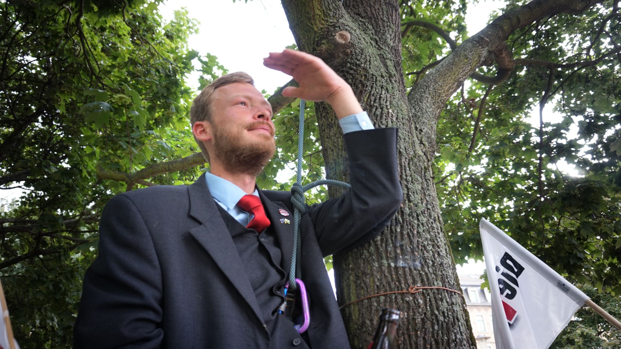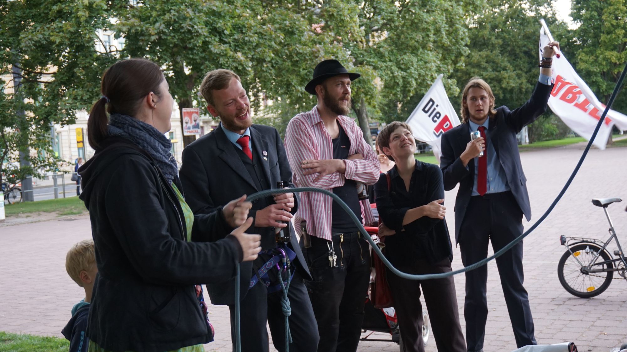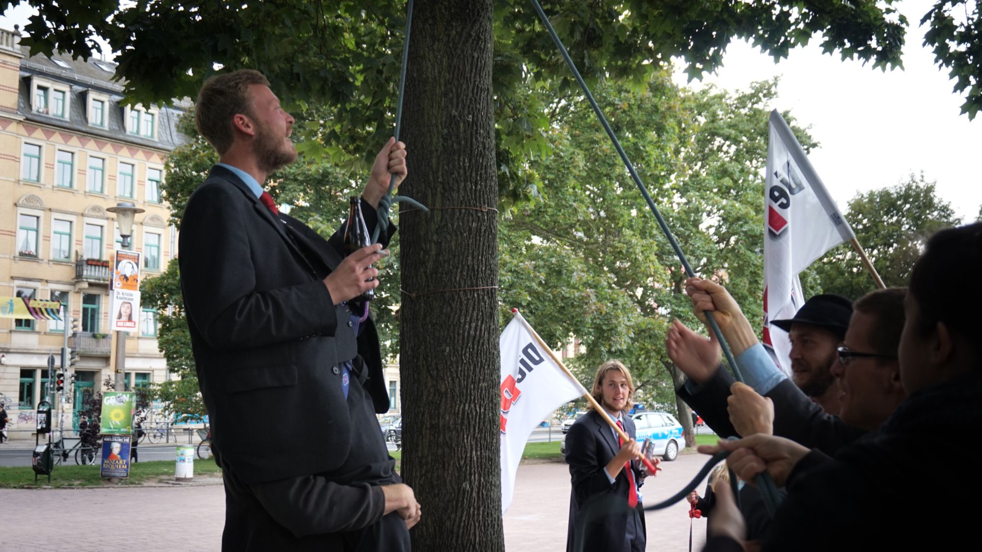 Direktkandidat Martin Hoferick vertraut in sein KönnenEin Wahlkampf-Märchen neigt sich würdevoll dem Ende: Zum letzten Mal vor dem Tag der Machtübernahme zogen DIE PARTEI mit ihren beinahe dreißig Genossenfreunden, welche für dieses Event extra aus ganz Sachsen angereist waren, durch die Stadt. Pünktlich zur Kaffee-Zeit – mit Sternburg im Schlepptau, Torte war leider aus – um 15 Uhr, versammelten sich die selbsternannten Spitzenpolitiker am Dresdner Hauptbahnhof. „Nur nicht rumtrödeln!“, lautete die Devise. Sechs Polizeifahrzeuge begleiteten die jungen Pioniere auf ihrem Siegeszug durchs „Disney-Land“, wie sie die Innenstadt liebevoll tauften. Ein inneres Bedürfnis zwang die Kolonne kurzerhand zum Pausieren auf der Prager Straße: Eine Gedenkminute für Stanislaw Tillich war längst überfällig. Eine weitere Minute der Stille wurde nötig, als die gut gelaunte Truppe am Info-Stand der Büso vorbeimarschierte: „Ein trauriges Schauspiel, sie waren gerade am Einpacken“, heißt es aus PARTEIkreisen. Mit wehenden Fahnen und überzeugtem Schritte schafften sie es schließlich in Rekordzeit auf die andere Elbseite, wo sie mit wilden Jubel-Schreien in ihrer PARTEI(hoch)hüpfburg erwartet wurden. Ein klares Zeichen: Ein Voodoo-Zauber lastet auf der CDUVor Selbstbewusstsein strotzend setzten sie auf „harte, seriöse“ Propaganda unter dem Motto: „Nur die besten Köpfe für Sachsen – Tillich in die Produktion!“. Gegen 17 Uhr eröffnete Martin Hoferick am Alaunplatz die Wahlkampfveranstaltung mit den Worten: „Macht ist geil. Erfolg macht sexy. Wir sind offen für alle, die sich uns anbiedern.“ Zur jüngsten Kommunalwahl in Dresden erzielte DIE PARTEI ein grandioses Ergebnis von 3,8 Prozent im Wahlkreis Neustadt: „Unsere Wählerschaft ist mit überdurchschnittlicher Intelligenz gesegnet – Spaßparteien wie CDU und FDP können davon nur träumen“, gibt sich der Direktkandidat Hoferick stolz. Die glotzende Meute ließ sich indessen von Louis Fürnbergs „Die-Partei-hat-immer-recht-Klängen“ hypnotisieren. Als Shooting-Star haben die Funktionäre ihren PARTEIhund Mogli mitgebracht, innerhalb von Sekunden bringt er den Inhalt des anrollenden Eiswagens zum Schmelzen. Das ganze Spektakel glich Frühsport am Nachmittag. Auch Mogli gibt sich überzeugt: Wuff, wuuuuff, wuuuuuuff“, so seine Worte Ihr Ziel, so DIE PARTEI, die letzten verbliebenen, noch unentschlossenen Wähler von ihrer Politik zu überzeugen. Dafür haben sie sich etwas ganz Besonderes einfallen lassen: Direktkandidat Martin Hoferick wurde (aus Geld- und damit Plakatmangel) für alle noch Unentschlossenen gut sichtbar im A-Park direkt aufgehängt. Noch ein letzter Zug an seiner Zigarette, ein letzter Schluck aus seiner Flasche Sternburg Export und dann heißt es auch schon Abschied nehmen: In über zwei Meter schwindelerregender Höhe baumelt NeustadtPARTEIkandidat Hoferick fröhlich vor sich hin. Vom Boden aus wird er bereits von den anderen Genossen als Märtyrer in der PARTEIgeschichte gefeiert. Kein Wahlkampf ohne passendes Equipment: „Merkel ist doof“DIE PARTEI ist überzeugt: „Mit dieser innovativen Maßnahme wird das Erreichen unseres Wahlziels (50%+X) voraussichtlich zur reinen Formsache werden.“ Schließlich passiert ein unerwartetes Wunder: Ohne sichtlich Schaden genommen zu haben tanzt der soeben Aufgehängte auch schon wieder über die Wiese: „Ich denke nun sollte jedem klar sein: Wir sind nicht zu stoppen. Wie Blutegel saugen wir uns an den anderen Parteien fest und werden als einziger Sieger aus der Landtagswahl hervorgehen.“