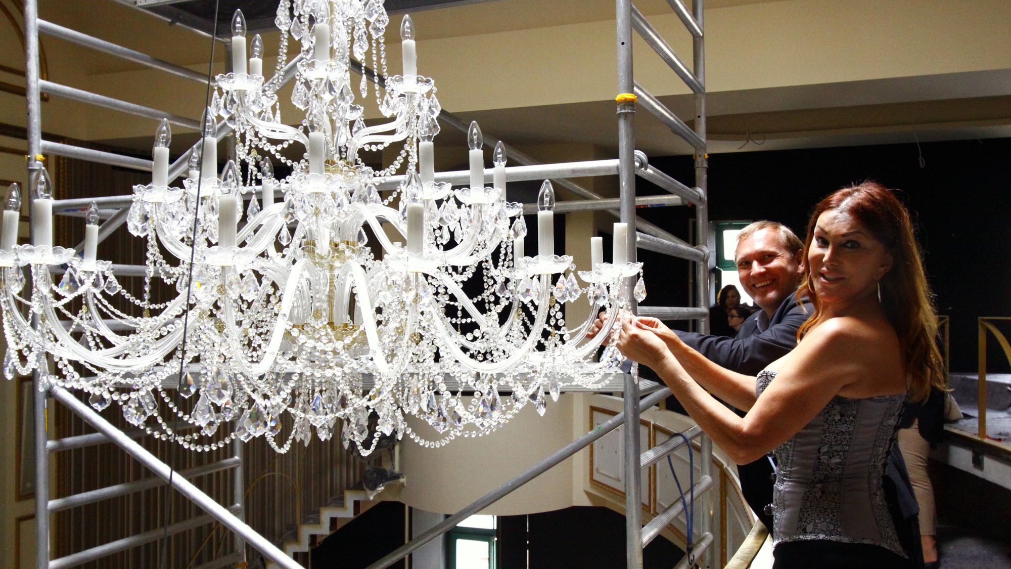 Heute wurde in Anwesenheit der Presse der zentrale Kronleuchter aufgehängt. Carte-Blanche-Chefin Zora Schwarz ist erleichtert: „So langsam nimmt das Innere des Gebäudes Form an – man sieht, dass es meine kleine Semperoper werden soll – Stil, Ästhetik, Kunst und ehrwürdige Tradition.“