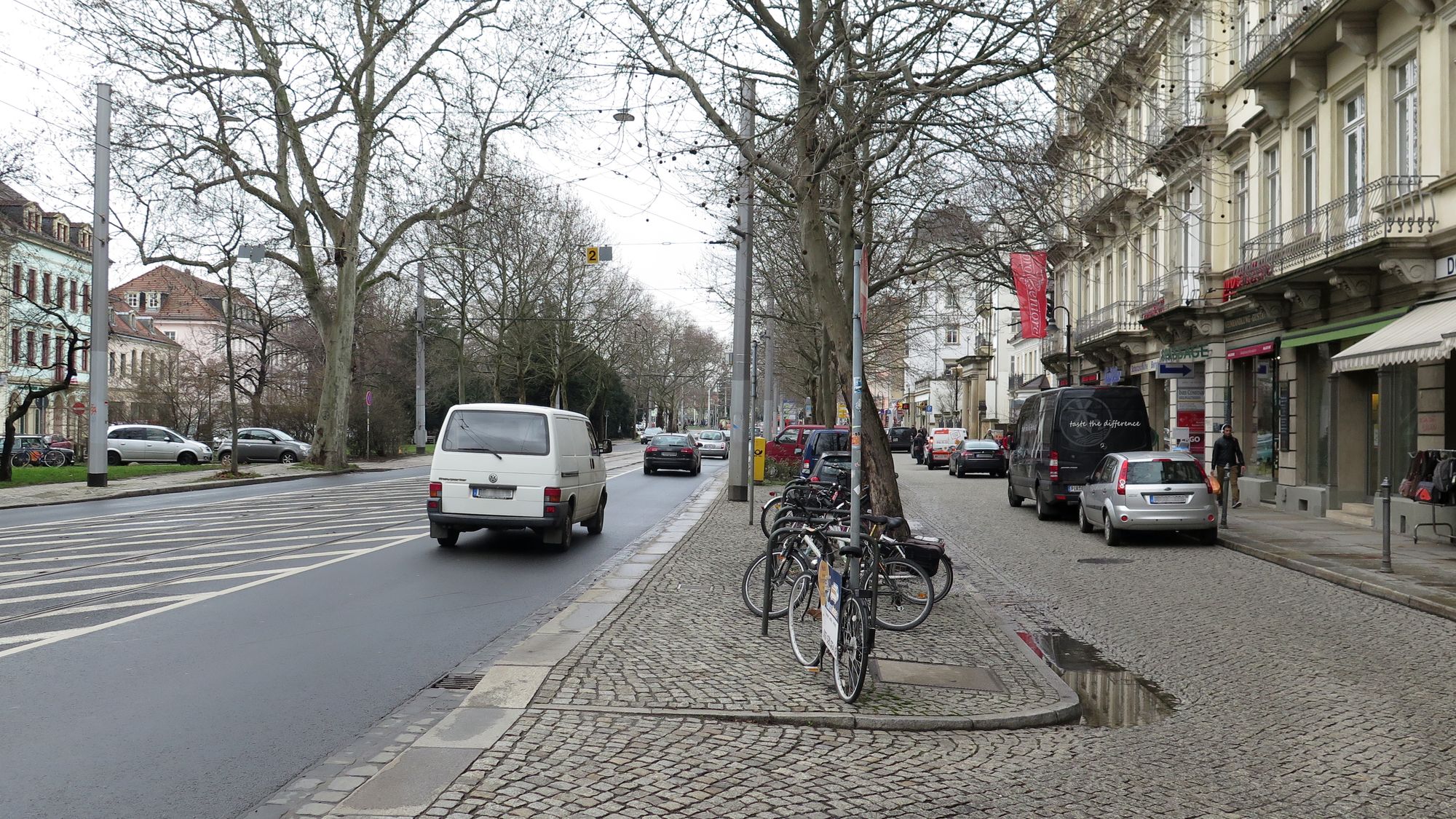 Für die Autospur bleiben dann noch 2,25 Meter bis zu den Bahngleisen übrig. Die Verbreiterung hat zur Folge, dass die sogenannte „Kleine Bautzner“, die Parallelstraße vor den Geschäften schmaler wird und die Längsparkplätze am Fahrbahnrand entfallen. Auf der Süd-Seite sollen die Radfahrer künftig über den Fußweg geführt werden.