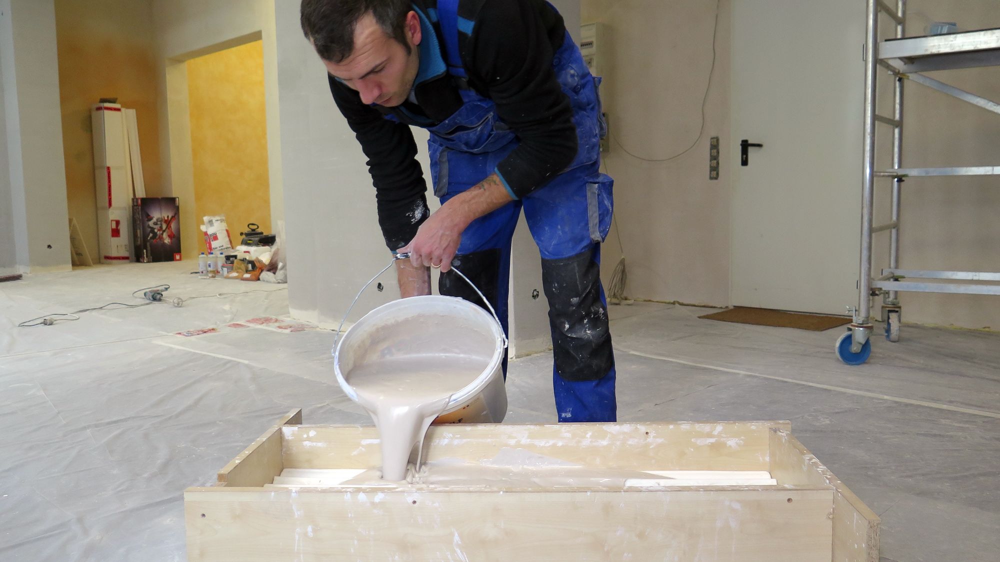 Leim- auf Ölfarbe.„Sehen Sie sich das an“, er zeigt auf alten Stuck an der Decke. Der war die ganze Zeit abgehängt und niemand wusste, was die Räume für Schönheiten beherbergen. Und an der Wand unter der Tapete treten die alten Farbschichten zu Tage. „Das ist alte Leimfarbe und Ölfarbe, zig verschiedene Schichten“, Faussner ist begeistert. Sein Handwerker Bogdan Grosu legt einzelne Schichten frei. Die sollen wie eine Mosaik so bleiben, der Rest des Raumes bleibt in dezentem Grau.