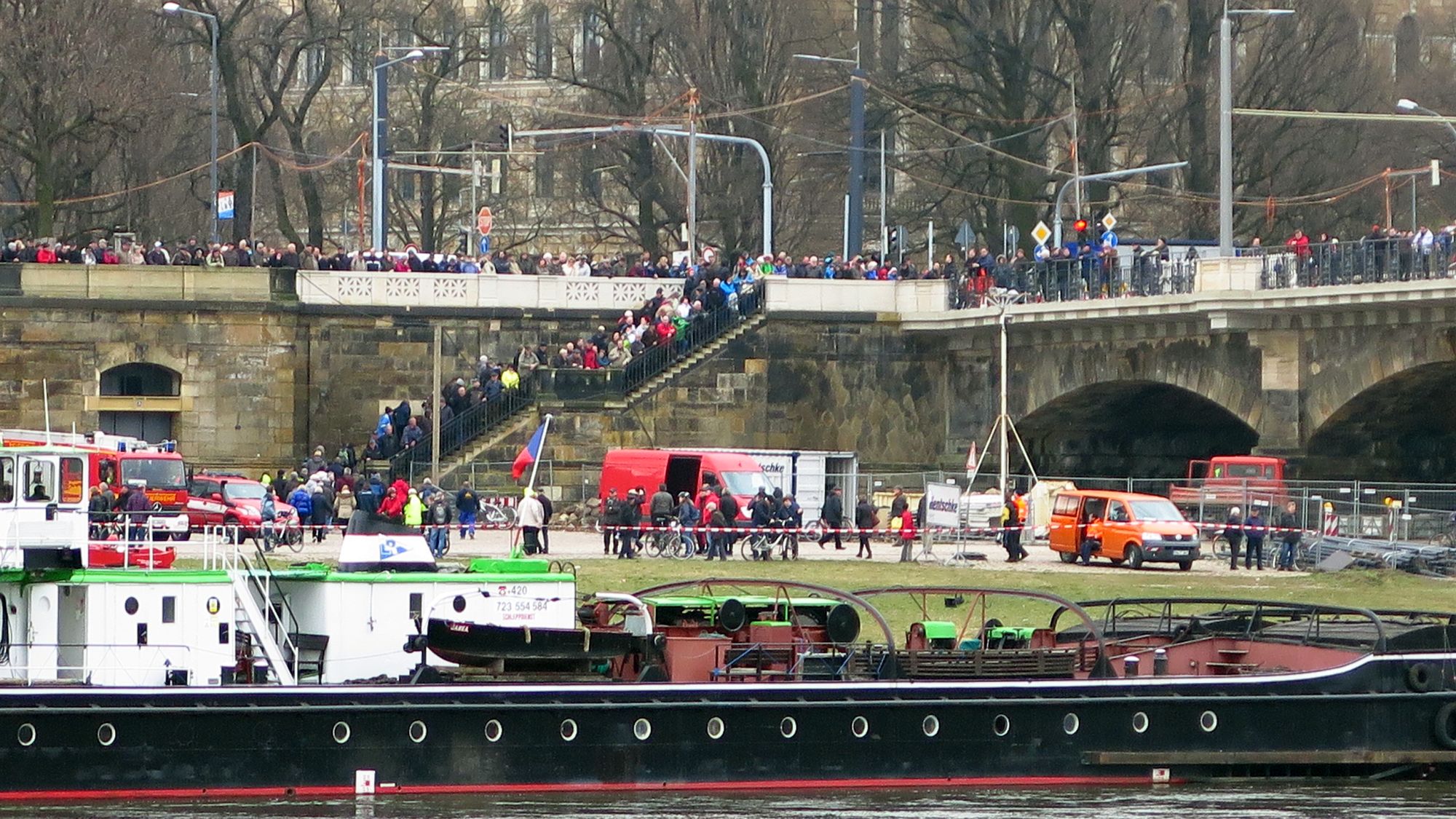 Hunderte Schaulustige hatten sich an beiden Elbufern versammelt. Sie ließen sich auch vom einsetzenden Regen nicht stören. Die Polizei musste das Gelände unterhalb des Käthe-Kollwitz-Ufers mit mehreren Durchsagen räumen, auch der Radweg am Rosengarten und die Albertbrücke wurden gesperrt. Der Salzfrachter hatte sich vor fast genau einer Woche, am 14. März, abends um 21 Uhr, wahrscheinlich wegen eines technischen Defektes quergestellt. Erste Bergungsversuche schlugen fehl. Der heutige Versuch war von Erfolg gekrönt, weil die Ladung, 800 Tonnen Salz inzwischen geborgen wurde und der Frachter so wesentlich leichter ist.