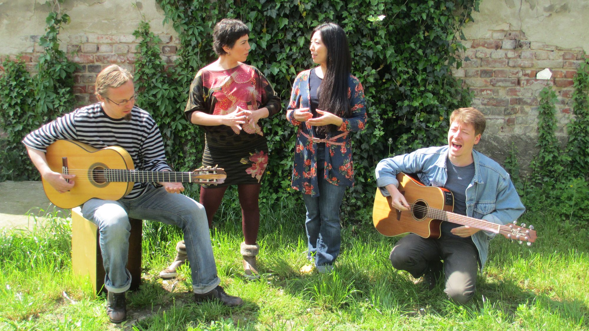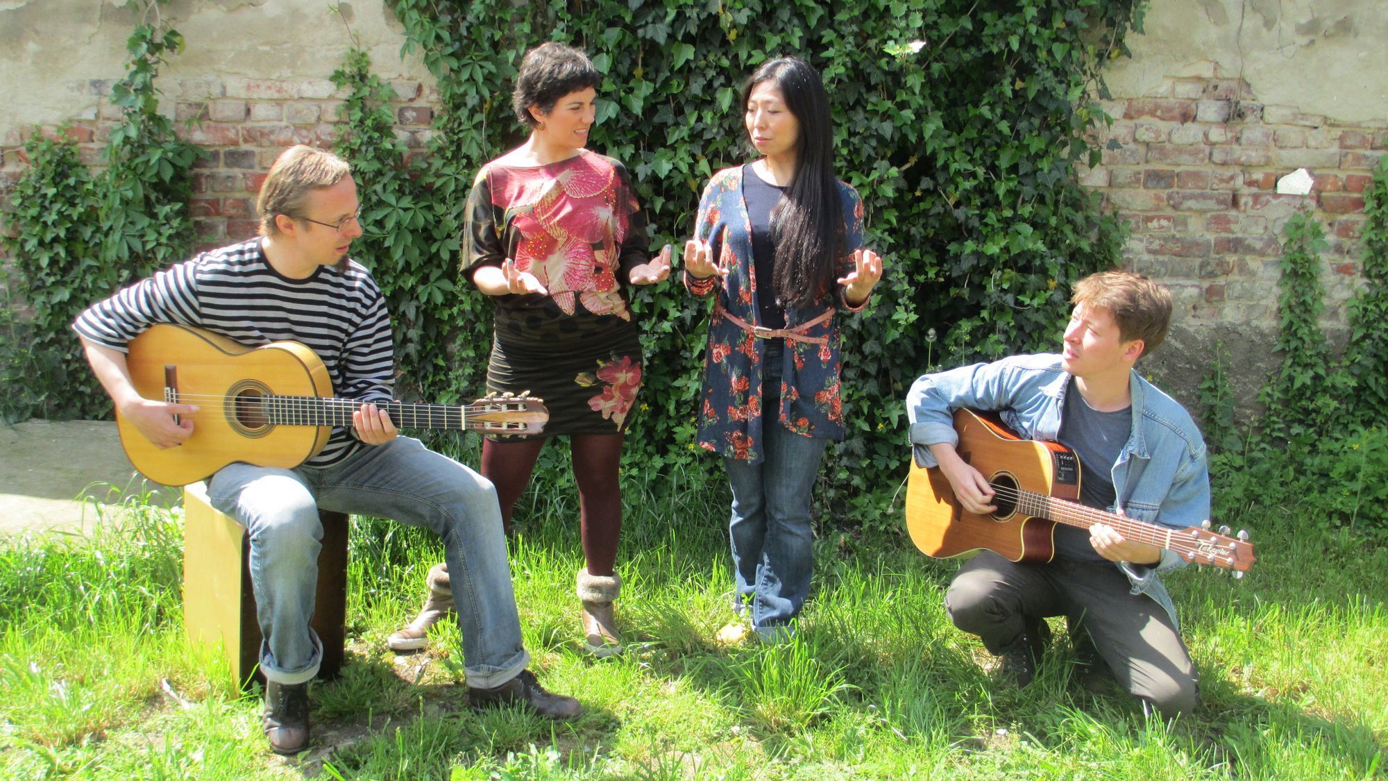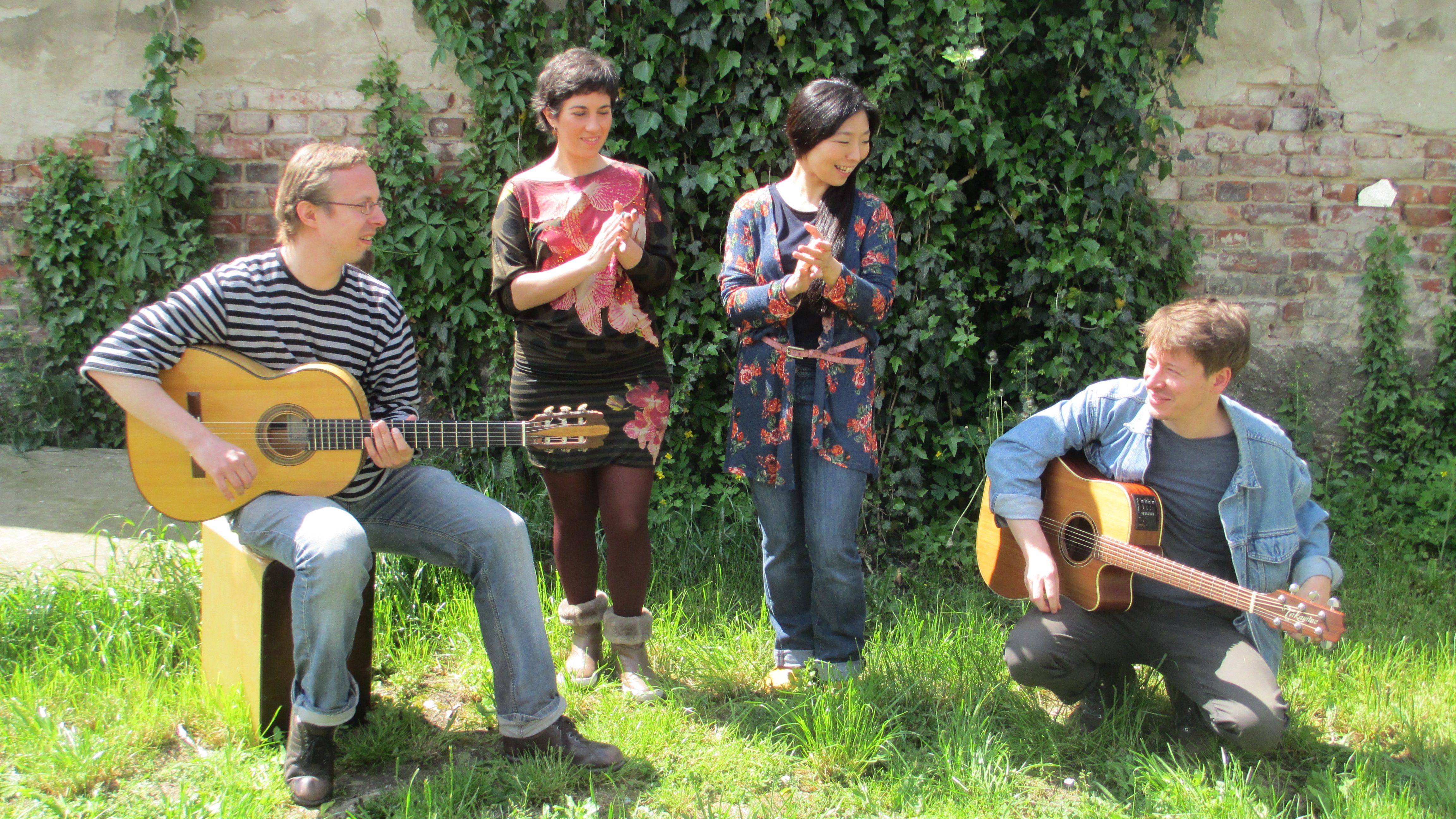 In der Scheune spielte Marmitako Anfang April ein mitreißendes, buntes Konzert, bei der auch eine eindrucksvolle Flamencotänzerin Rhythmus aus dem Boden klopfte. Die Suche nach mehr davon führte auf die Spur von Taconeo. Taconeo, das bedeutet „aufstampfen“ und beschreibt den Rhythmus des Flamenco. Tacon bezeichnet den Absatz des Schuhs. In diesem Fall speziellen Fall bezeichnet Taconeo vier Musiker, die regelmäßig in der Tanzschule El Patio in der Blauen Fabrik zum Proben zusammenfinden. Migiwa Shimizu, Johannes „Josel“ Ratsch und Maria Mellado (nach der Mama) Prenda (nach dem Papa) repräsentieren den Flamenco: Migiwa tanzt, Maria schreibt und intoniert die Texte und Josel lässt dazu Gitarrensaiten klingen. Letzter im Bunde ist Johannes Till, er bringt mit seiner Gitarre Jazz mit ins Spiel: „Wir lassen es bei diesem Oberbegriff. Damit können die Leute etwas anfangen“, schmunzelt er.