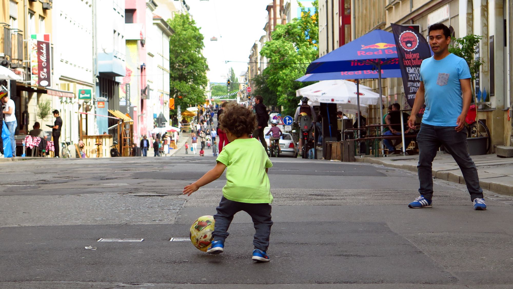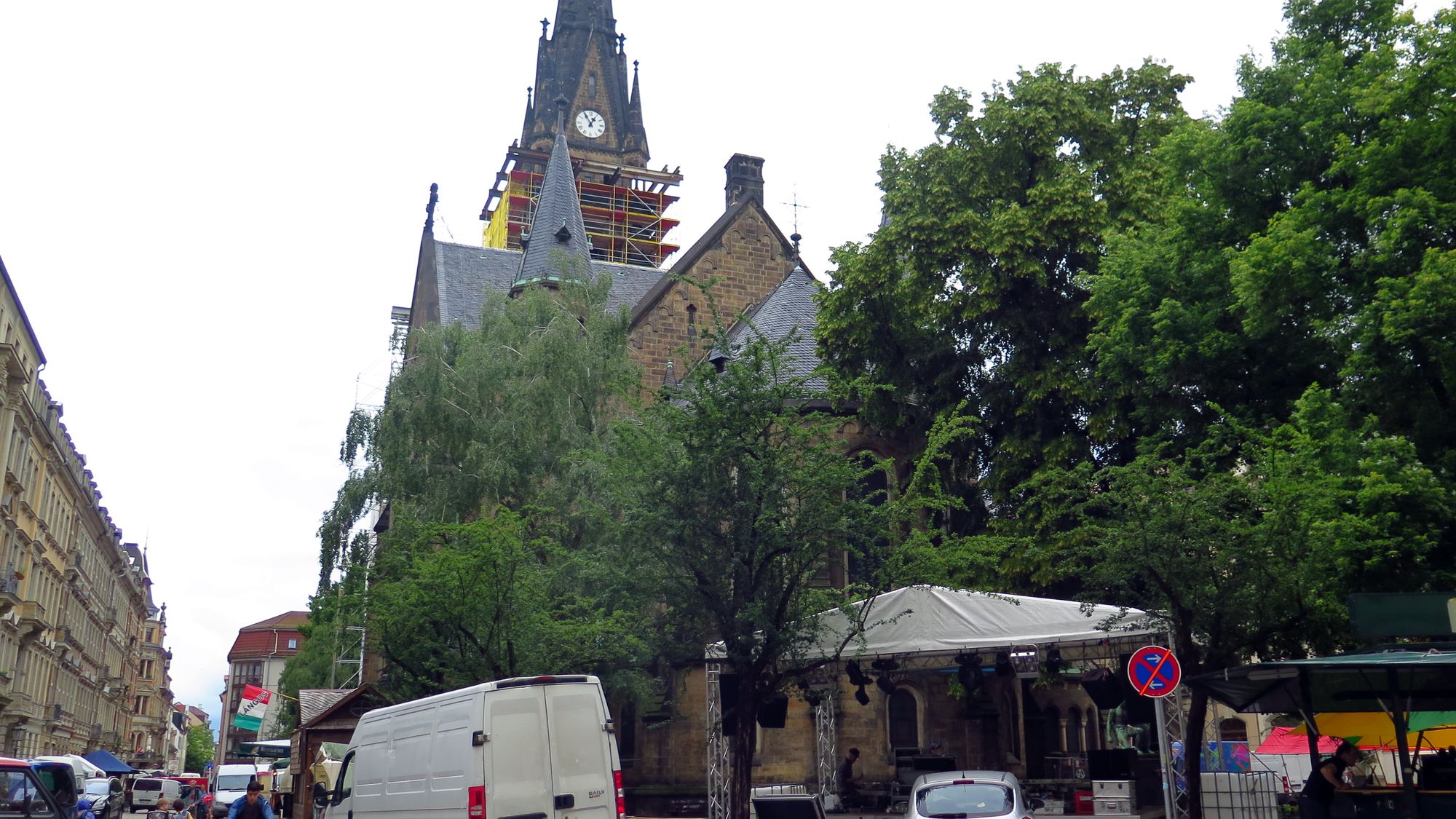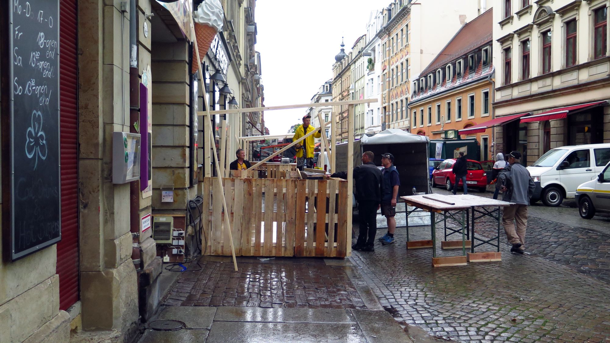 Eifriges Treiben auf dem Martin-Luther-Platz, die zwei Bühnen stehen schon. Beide etwas anders als im Vorjahr, vermutlich wird es in diesem Jahr hier am vollsten. Auf der Pulsnitzer zeigen die Vier-Vogel-Pils-Jungs stolz ihr nigelnagelneues Radler und diskutieren mit dem Ordnungsamt. Auch um die Ecke die Talstraße schmückt sich schon.
