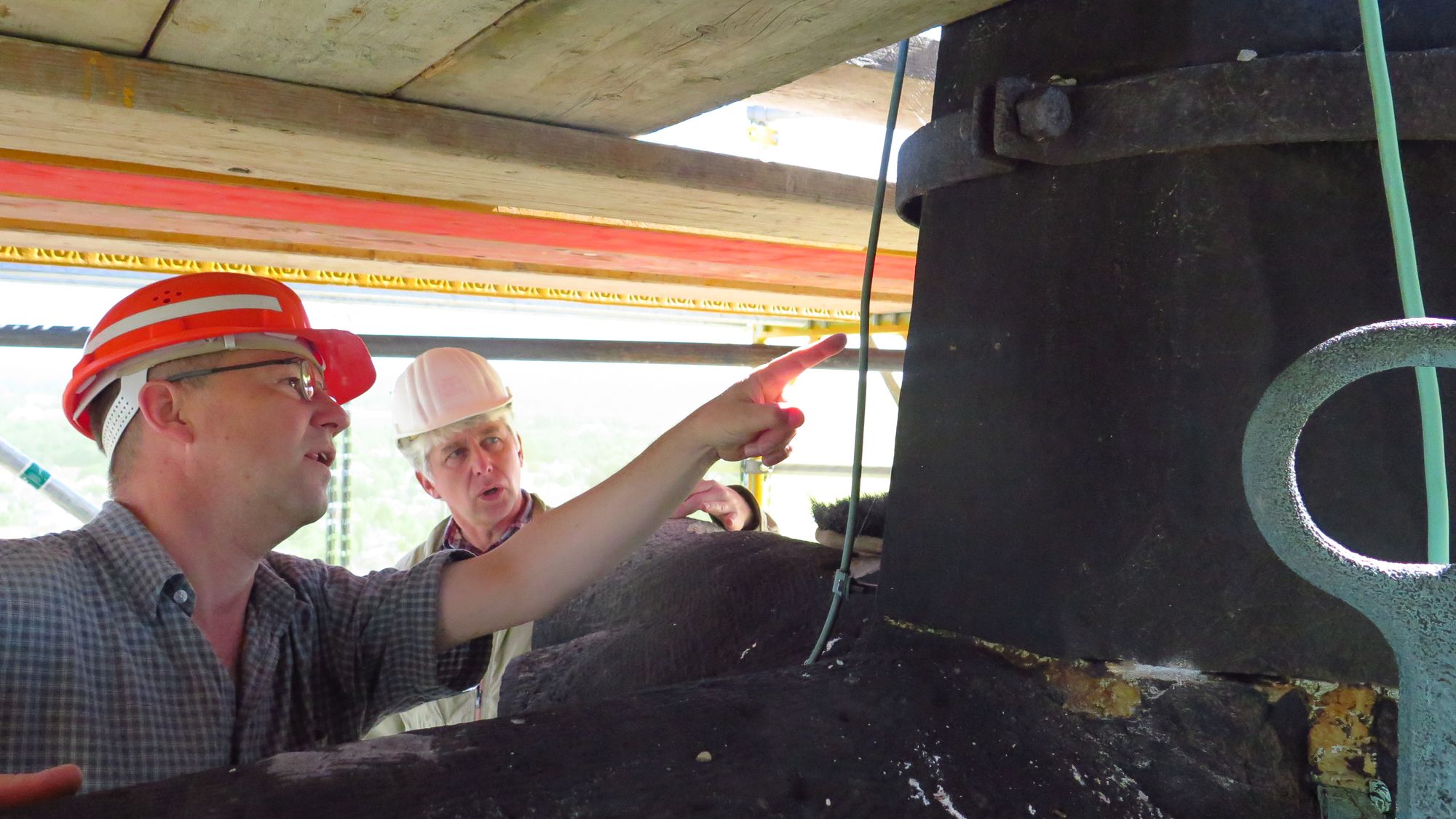 Es ruckt. Schwingt kurz nach. Dann steht es. Ich setze die Kamera ab und muss mich erstmal festhalten. Ach was, mir wird doch nicht schwindlig. Gemeinsam mit Pfarrer Eckehard Möller bin ich auf dem Weg ganz nach oben. Zwei Drittel haben wir geschafft, jetzt steigen wir in den zweiten Fahrstuhl um.