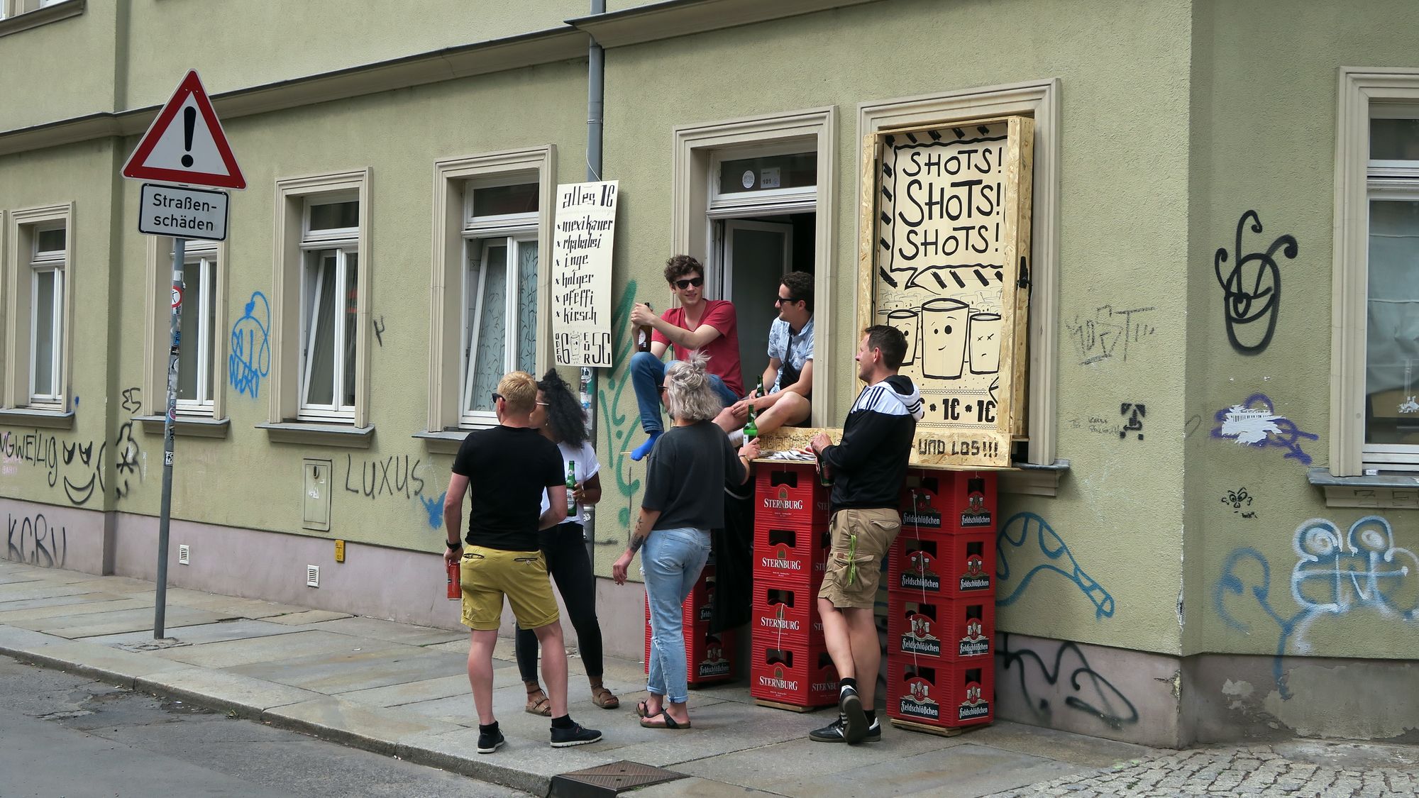 Vor Jahren gäbe es mal Absprachen, dass die verschiedenen Veranstalter sich zum Ablauf der „Beschallung“ abstimmen. So musste aber Tir na nog gegen drei Beschaller an der Alaunstraße 24/25 kämpfen!!