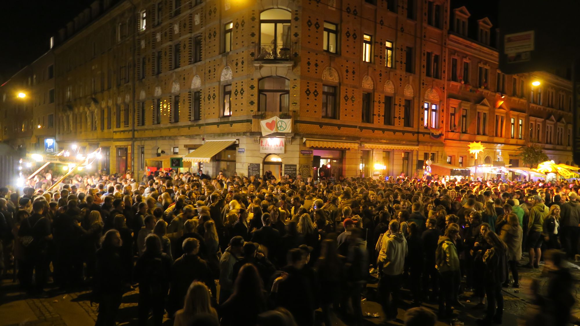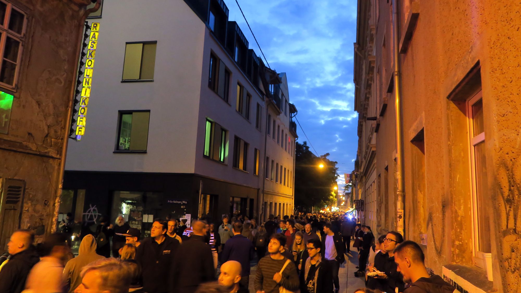 Zur Rothenburger hin wird es lauter. „Rummel-Techno“ hat es ein radfahrernder Neustadtspaziergänger genannt. Nun, jede Menge Bumm, Bumm gibt’s vorm Calzador. Doch auch hier vergnügte Gesichter. Junge Leute, die mit ihren Beinen schlenkern. Doch der Anteil der glasigen Augen nimmt zu. Schnell weiter. Auf der Alaunstraße ist es nun endgültig richtig voll.