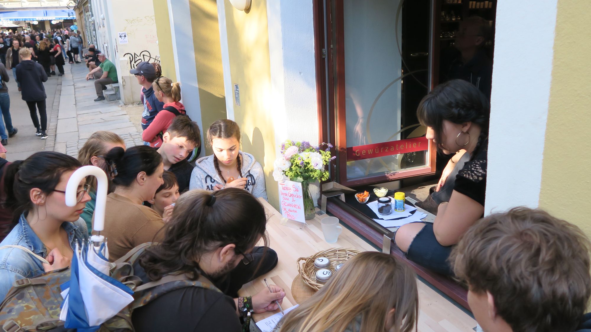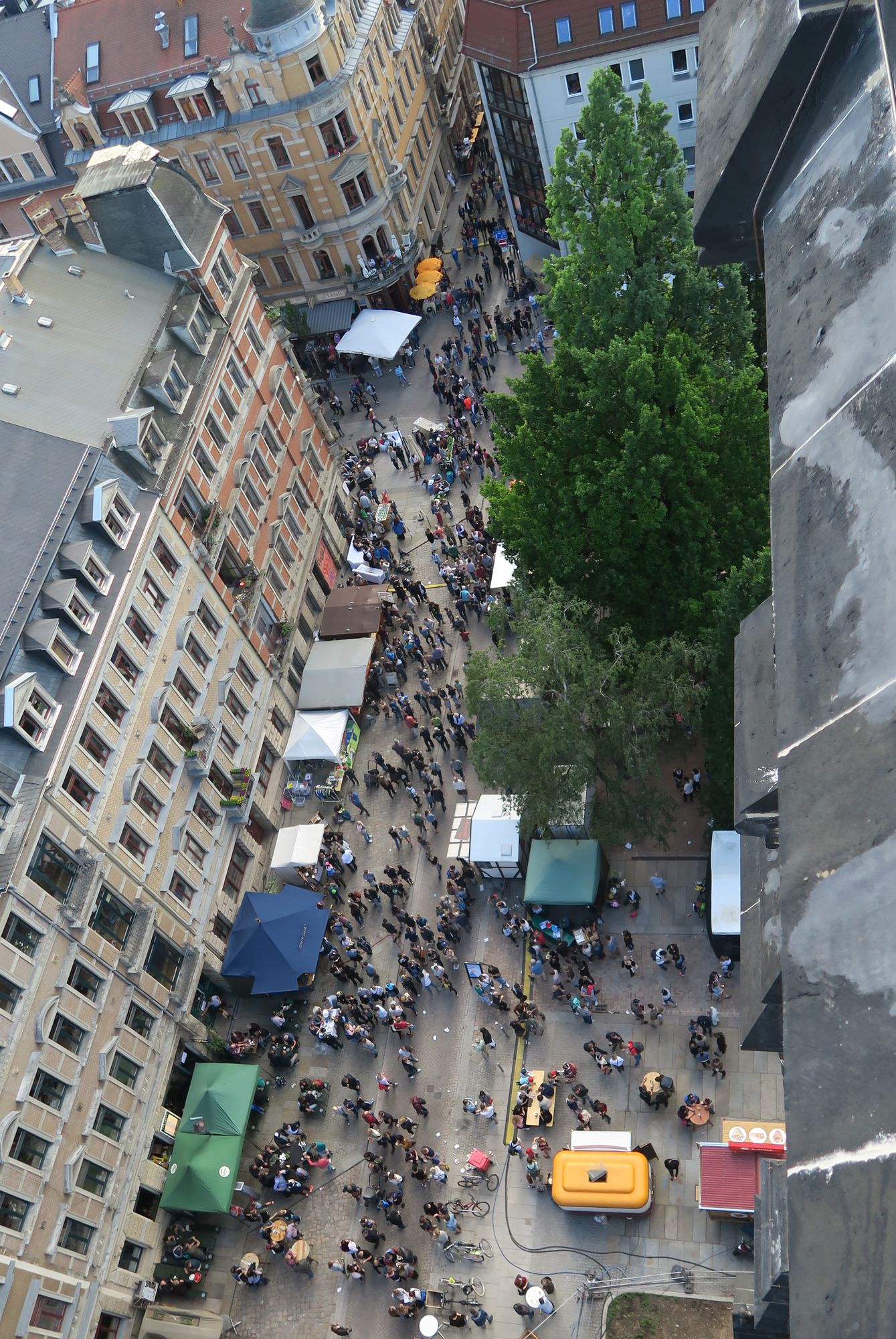 Die Neustädter sind kreativ und reagieren auf die belämmerte Stand-Anmeldesituation: Nie gab es mehr offene Fenster und lustige Aktionen davor und darin. Am Zafaran konnte man schnuppern, Büchsenwurf auf der Böhmischen, Bierbons und Shots aus den Obergeschossen, selbstegemachte Liköre, Pudding-Leckereien und natürlich Kuchen, Kuchen, Kuchen. Gut für den Kalorienhaushalt, dass ich so viel laufen musste.