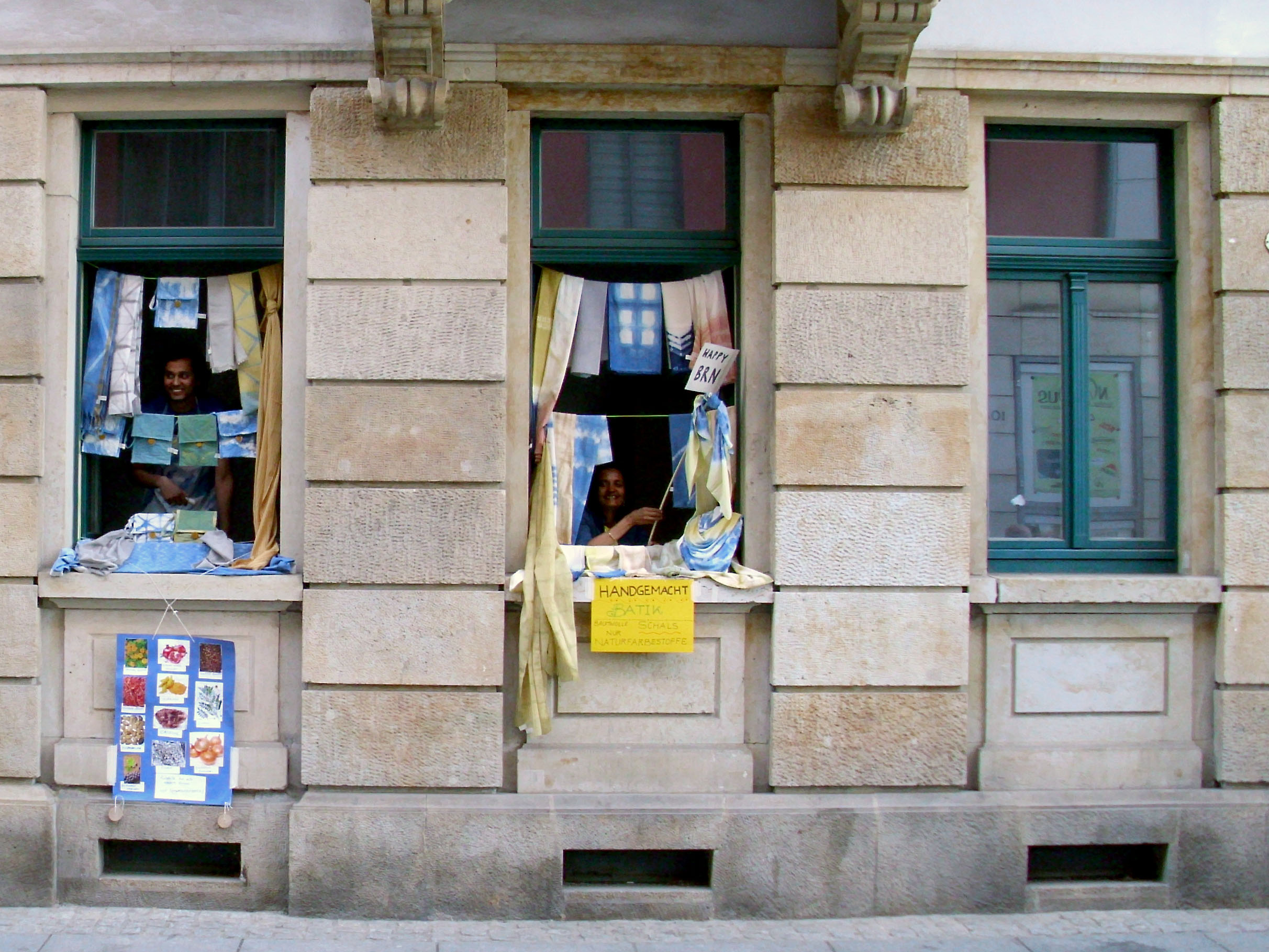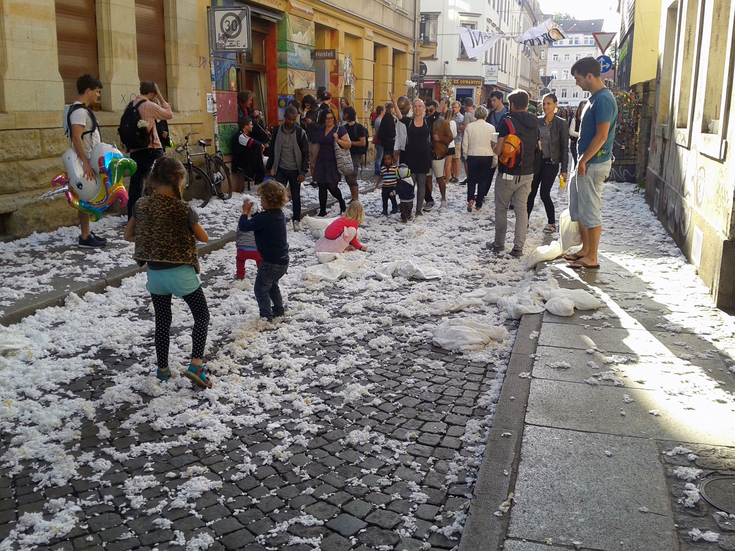 Dennoch war es insgesamt ein schönes Fest. Fast zu jeder Stunde kam man an Engstellen prima durch. Engagierte Anwohner konnte man mit witzigen Aktionen bestaunen, so man sie denn fand. Am Sonntag tafelte die halbe Neustadt wieder zum großen Gemeinschaftsfrühstück auf der Straße. Neben den vielen Rummel-Techno-Türmen gab es auch eine Menge interessanter Musik zu bestaunen. Tolle Shows gab es im Kukulida-Zelt, den Luther-Platz-Bühnen, zum Sonntags-Tanz vorm Laika und natürlich bei den Punkrockern auf dem Alaunplatz. Aufsehen erregte der brachiale Umzug der Samba-Universo-Trommler. Herrliche Publikumsaktion: Die Schokokuss-Maschine auf der Kamenzer Straße.