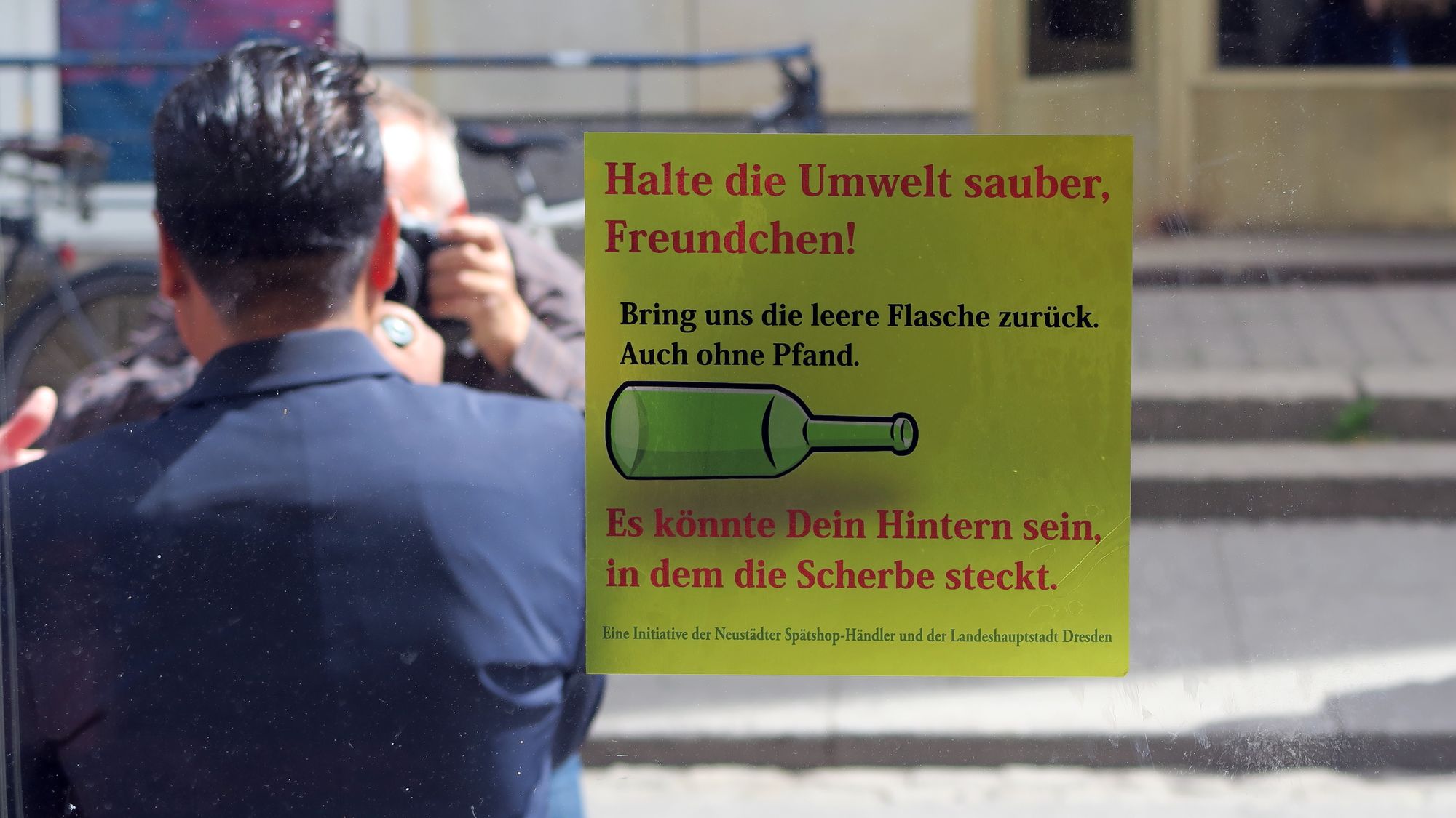 Hintergrund: In einem Vertrag haben sich die Spät-Shop-Betreiber verpflichtet, auch pfandfreie Flaschen (Wein, Sekt, Schnaps) wieder zurück zu nehmen. Das Projekt wurde heute in Anwesenheit des Ortsamtsleiters André Barth im „Food 5“, dem Spätshop-Supermarkt in der Alaunstraße 2 vorgestellt.