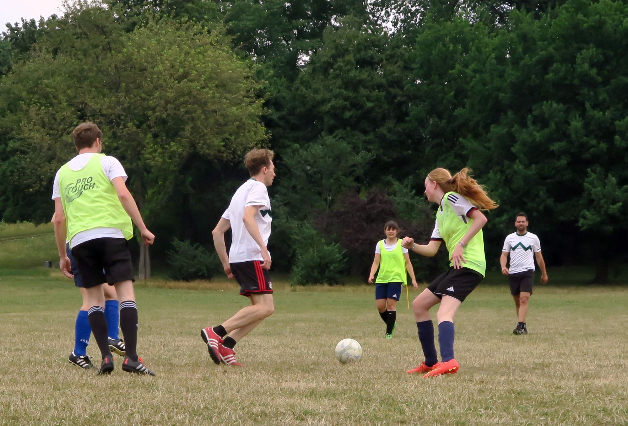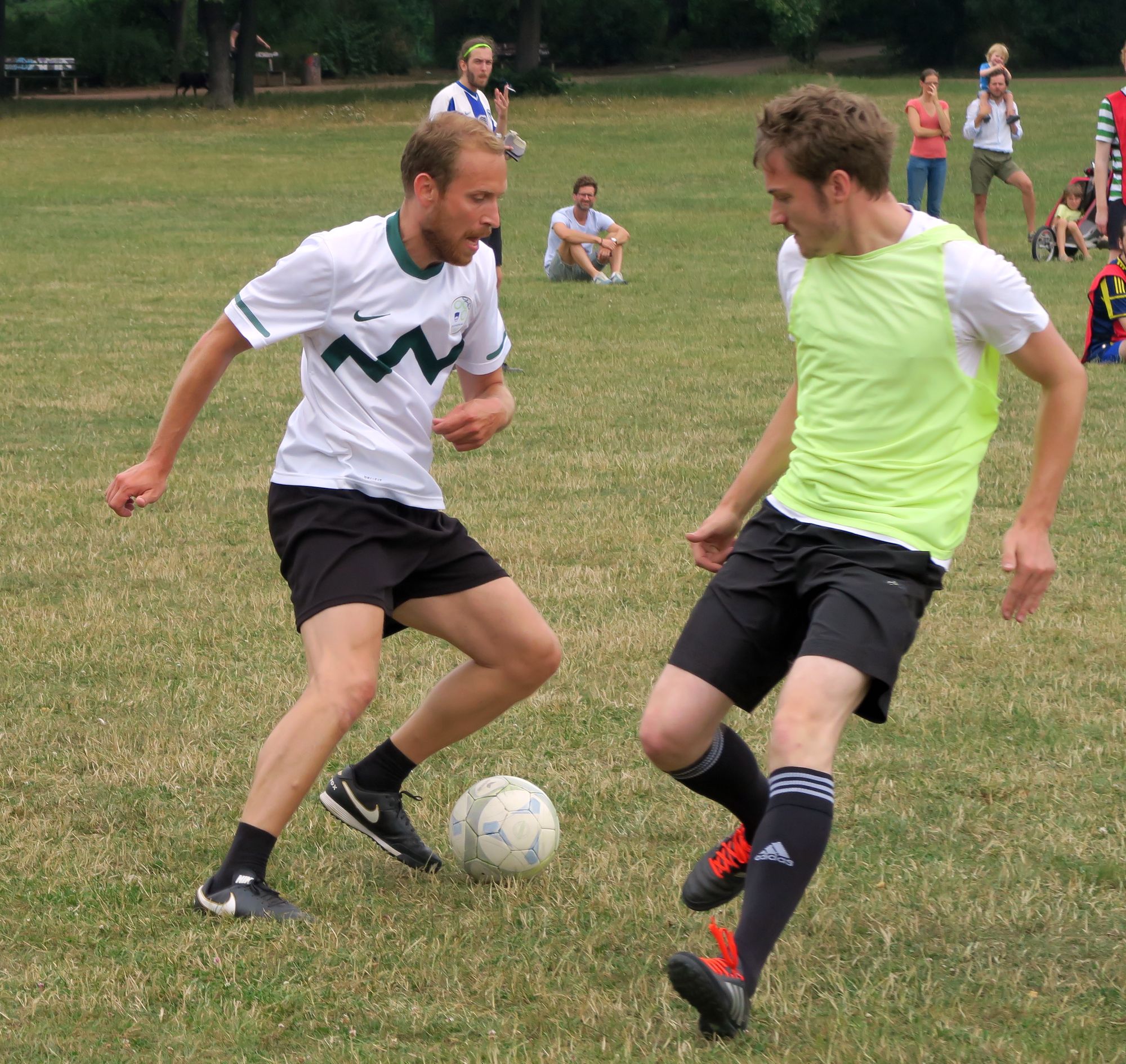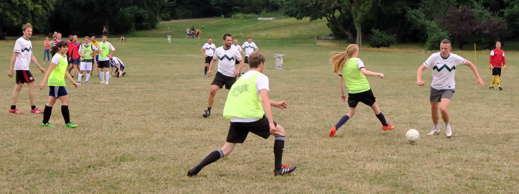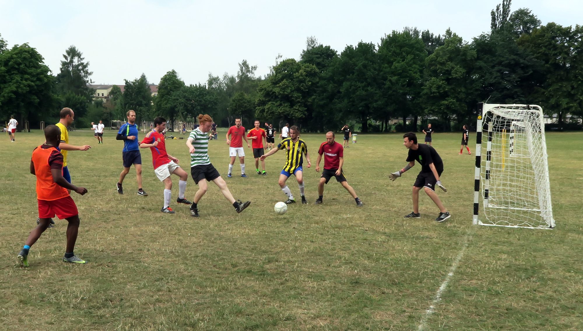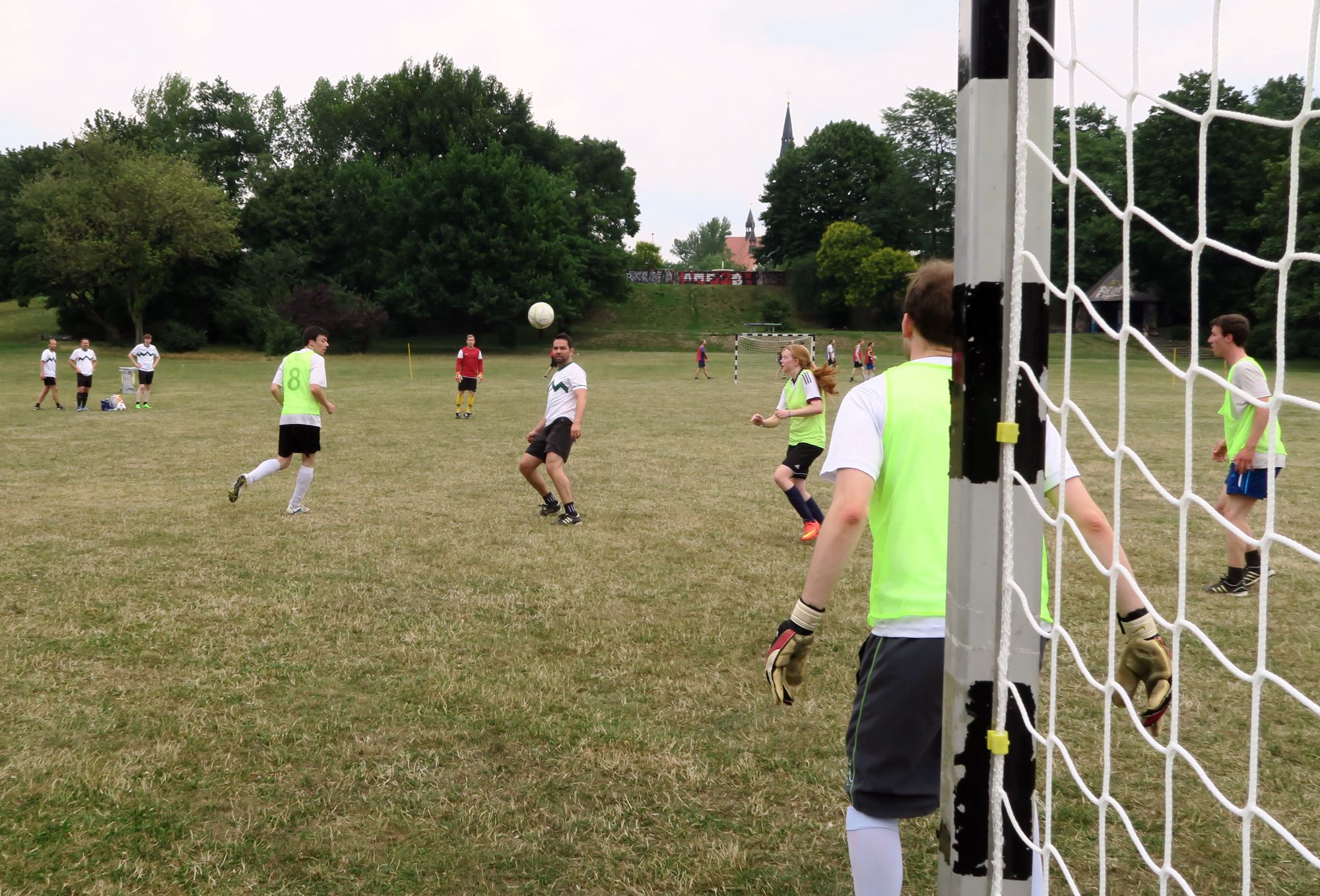 Die ersten Spiele startete um 11.11 Uhr. Teams mit so hippen Namen wie „DTDMPABG – das Team, dass mir persönlich am Besten gefällt“ oder einfach „Neuse“ oder „Rote Buchse Neustadt“ traten an, um in 10-Minuten-Runden Punkte zu sammeln. Mit Schiedsrichter, mit Handballtoren, mit (teilweise allerdings schlecht erkennbarer) Außenlinie, sogar Eck-Stangen waren da.