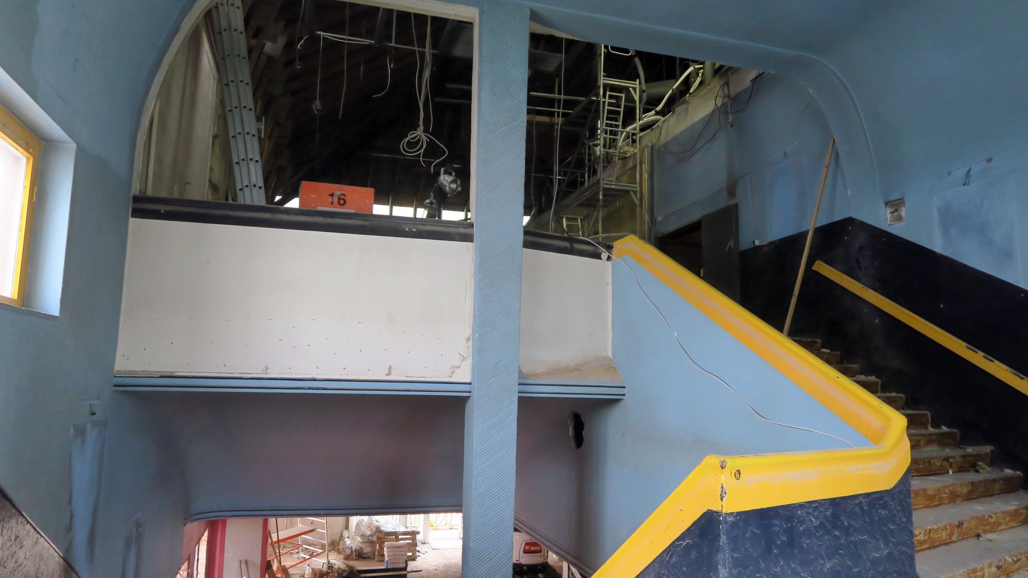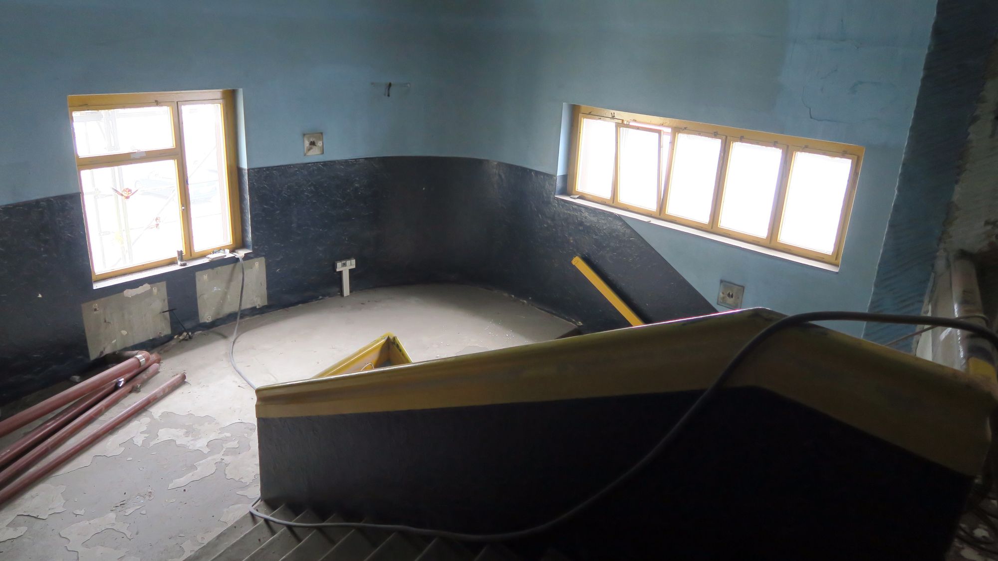 Besonders gründlich wird das Foyer umgestaltet. „Wie man derzeit gut sehen kann, ist hier alles auf Sand gebaut“, schmunzelt Ostertag und zeigt auf die sandige Grube. Das ganze Foyer soll luftiger und heller werden, das liegt vor allem an der Öffnung der bislang zugemauerten Fenster. Damit öffnet sich die Schauburg künftig mehr zur Straße hin. An dieser Stelle wird die Schauburg dann auch um reichlich fünf Meter in die Höhe wachsen, um den neuen Saal aufzunehmen.