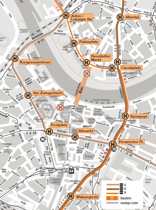 Für die jetzt folgenden Bauphasen an der Augustusbrücke müssen auch die Straßenbahnen ihren Platz in der historischen Altstadt vor der Semperoper vorübergehend räumen. Die Umleitung bleibt für gut ein Jahr bestehen. In dieser Zeit können am Theaterplatz keine Bahnen halten. Um zumindest die Station „Neustädter Markt“ in Abwesenheit der Linie 4 auch am Abend zu bedienen, wird die Linie 9 in ihrer Einsatzzeit verlängert. Deshalb verkehren täglich von etwa 22:30 Uhr bis 0:30 Uhr Bahnen als „E9“ zwischen Mickten und Hauptbahnhof.