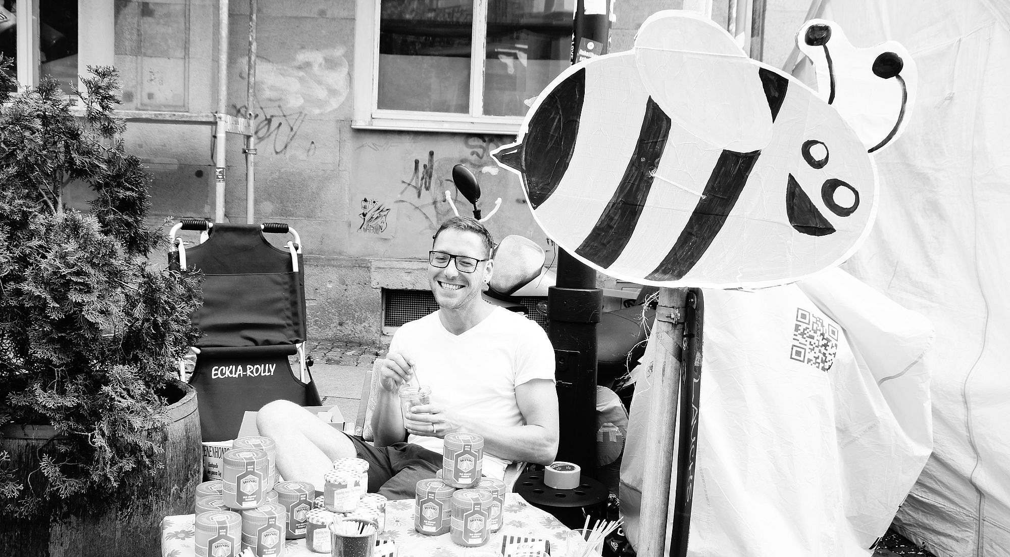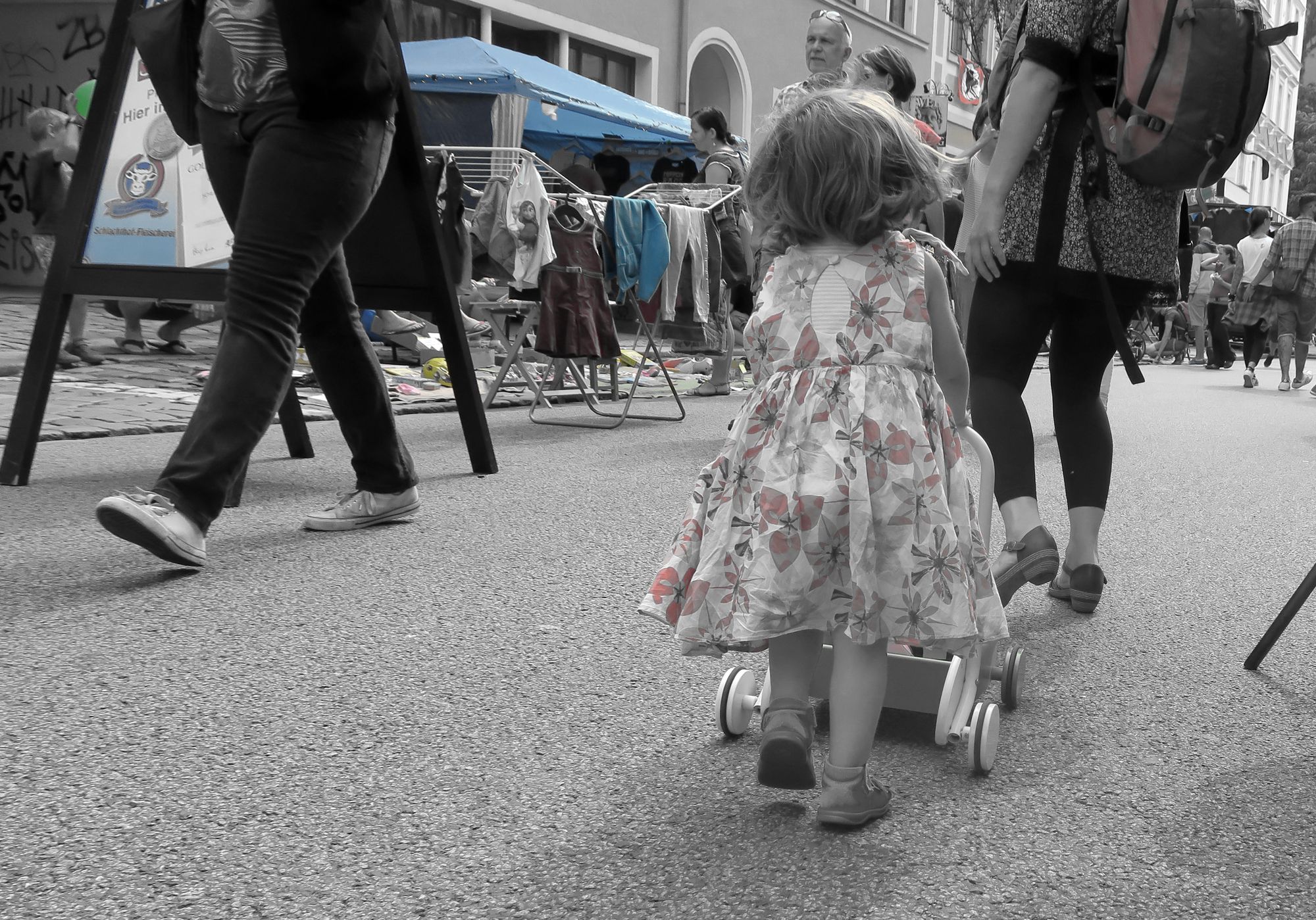 Die Hechte tummeln sich. Schon der erste Flohmarktstand belehrt mich, dass es immer gut ist, einen Beutel dabei zu haben. Weiter oben ist noch ein Glas selbst gemachter Honig dazu gekommen und die Not treibt mich an den SPD-Stand.