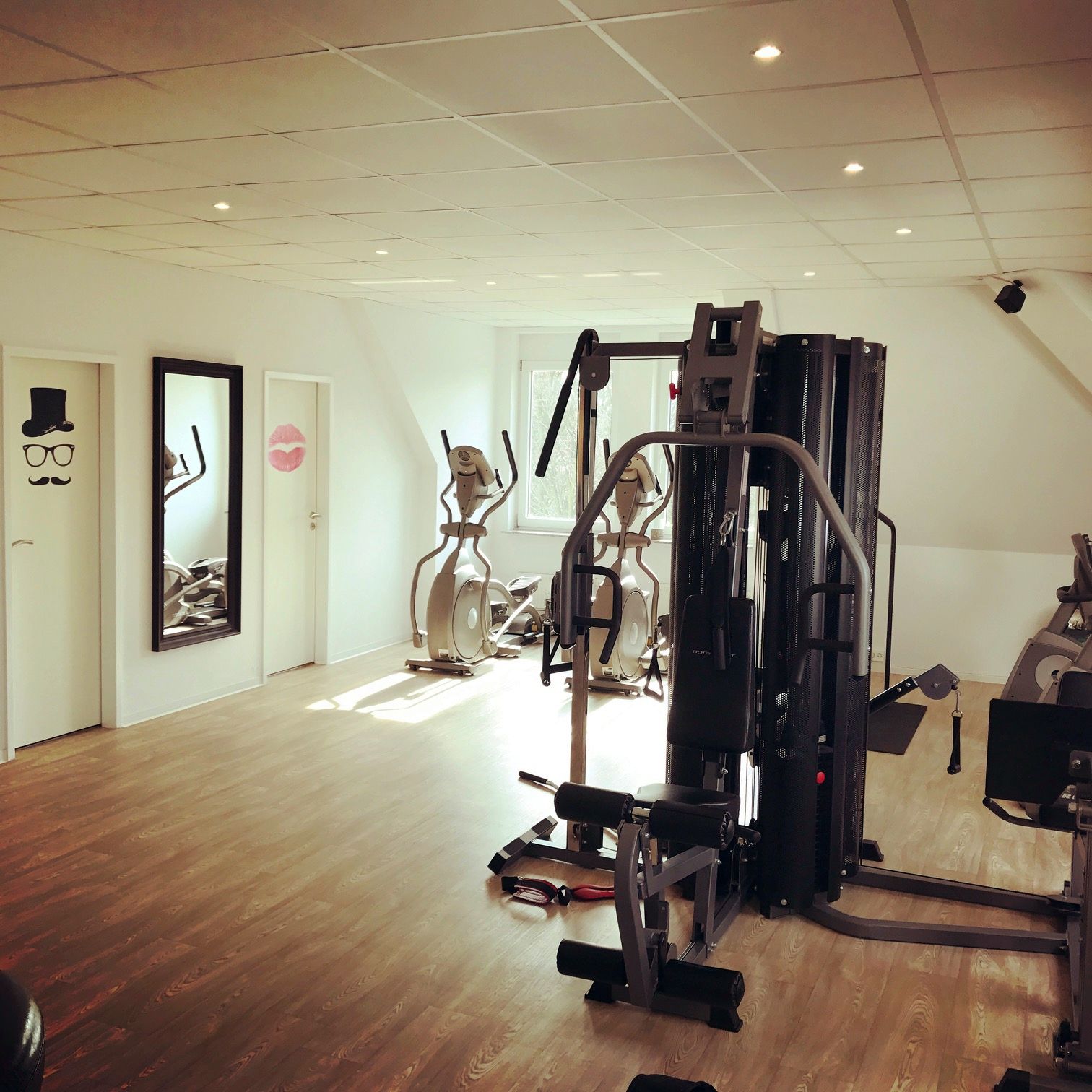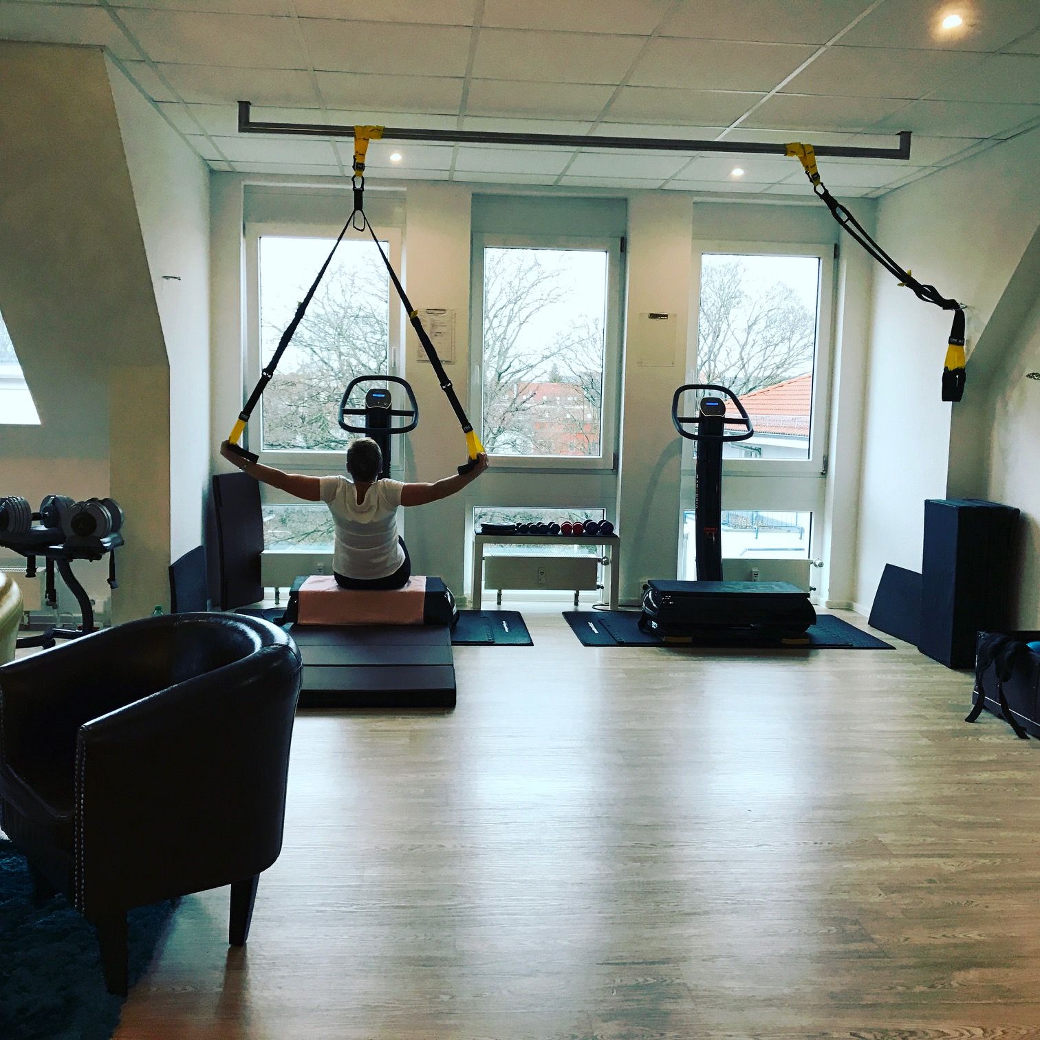 Als oben die Tür aufgeht, bin ich einer anderen Welt. Hell ist es hier. Die Sonne blinzelt durch die Baumwipfel direkt in das Studio. Ein netter Trainer begrüßt mich: Kaffee? – Nee, lieber ein Wasser. In der Umgebung. Auf dem Parkett stehen locker ein paar Geräte verteilt, die werden mir gleich erklärt, doch erstmal genieße ich den Ausblick. Von hier kann man direkt über die Kleingärten im Prießnitzbogen blicken.