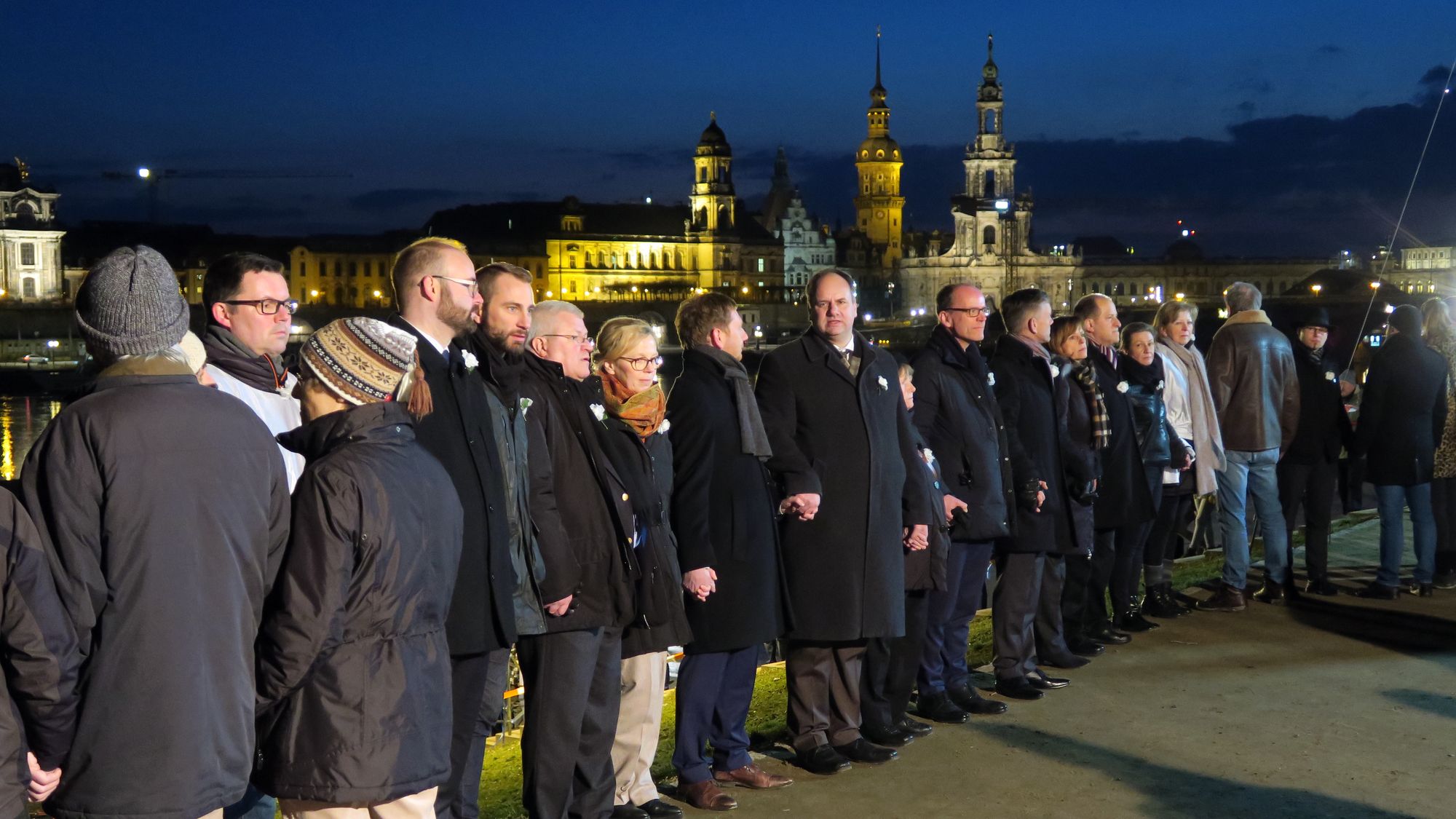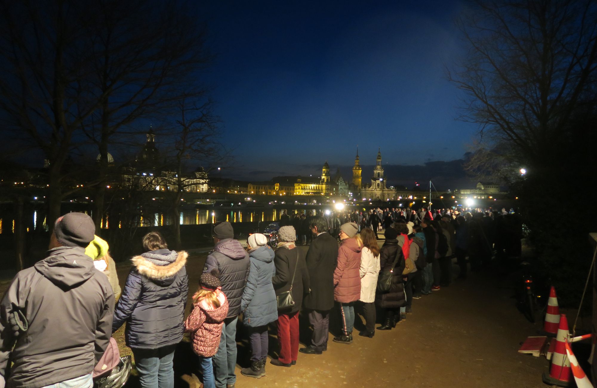 Die Teilnehmer erinnerten an die Zerstörung Dresdens vor 73 Jahren und setzten ein weit sichtbares Zeichen des Miteinanders für eine weltoffene, tolerante Stadt.