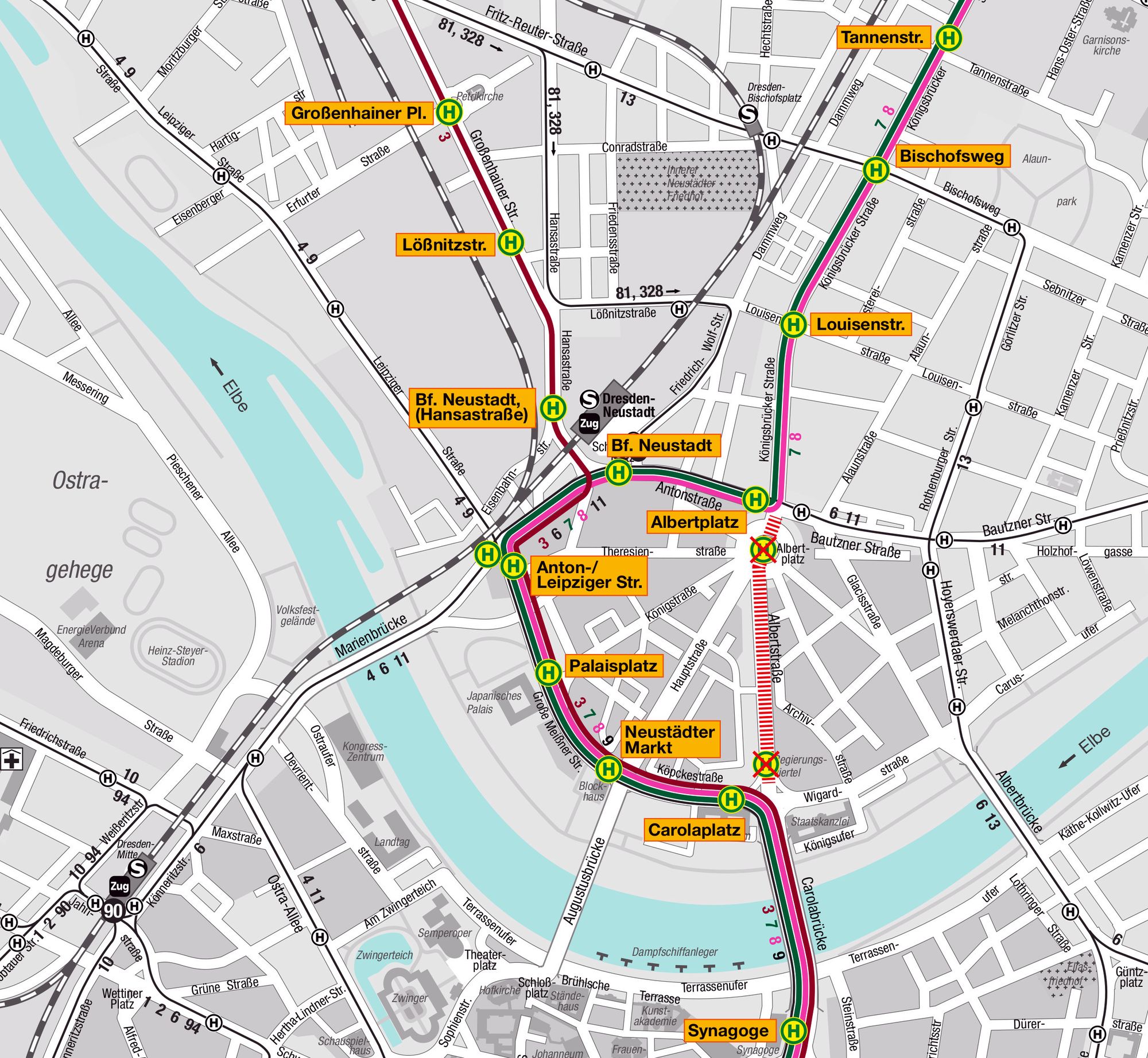 - Linien 7 und 8: Zwischen Carolaplatz und Königsbrücker Straße über Neustädter Markt, Anton-/Leipziger Straße, Bahnhof Neustadt und Antonstraße.