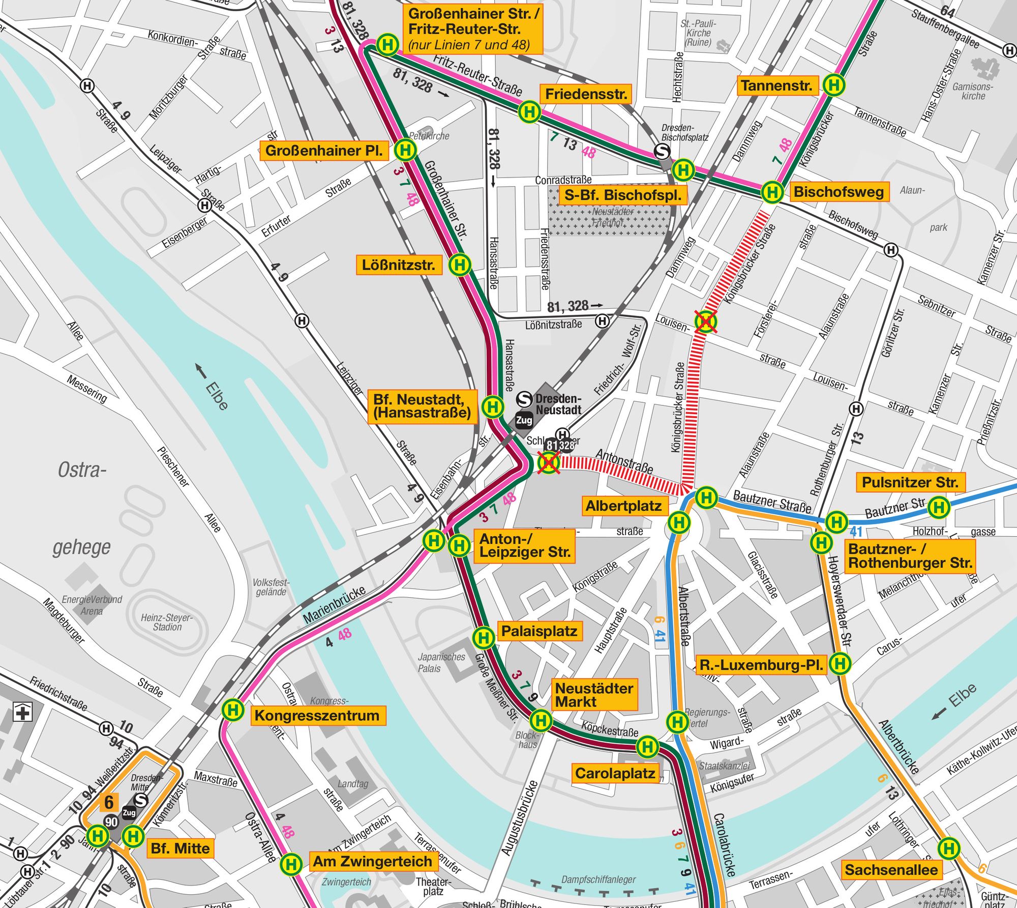 - Linie 7: Zwischen Carolaplatz und Königsbrücker Straße über Neustädter Markt, Anton-/Leipziger Straße, Bahnhof Neustadt, Großenhainer Straße, Fritz-Reuter-Straße und Bischofsweg
